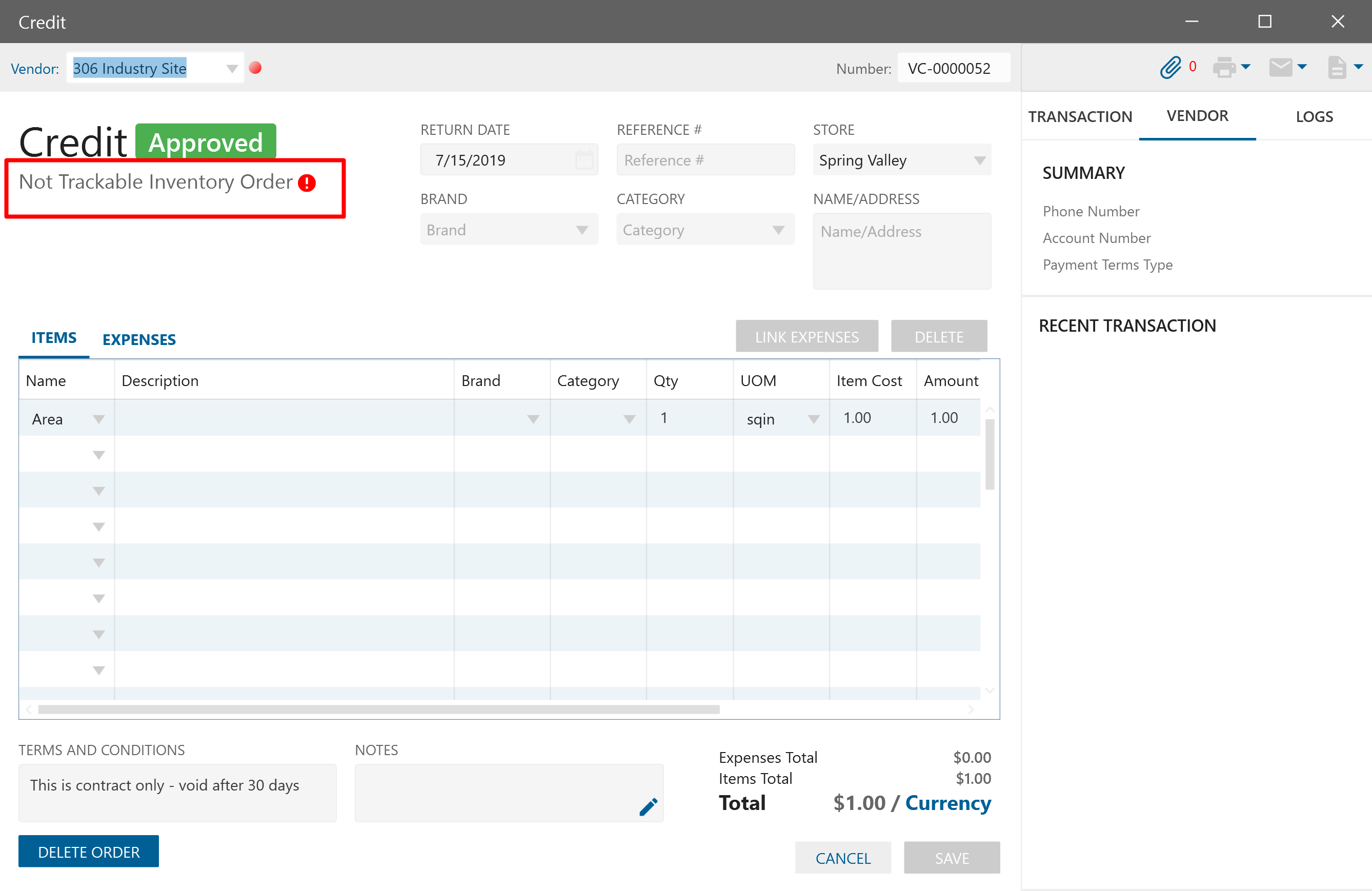 - after saving, increasing, decreasing, deleting Items in the Vendor Credit that has Inventory flag “Not Trackable Inventory Order”, such Vendor Credits don’t influence on the Inventory Items and qtys aren’t changed.