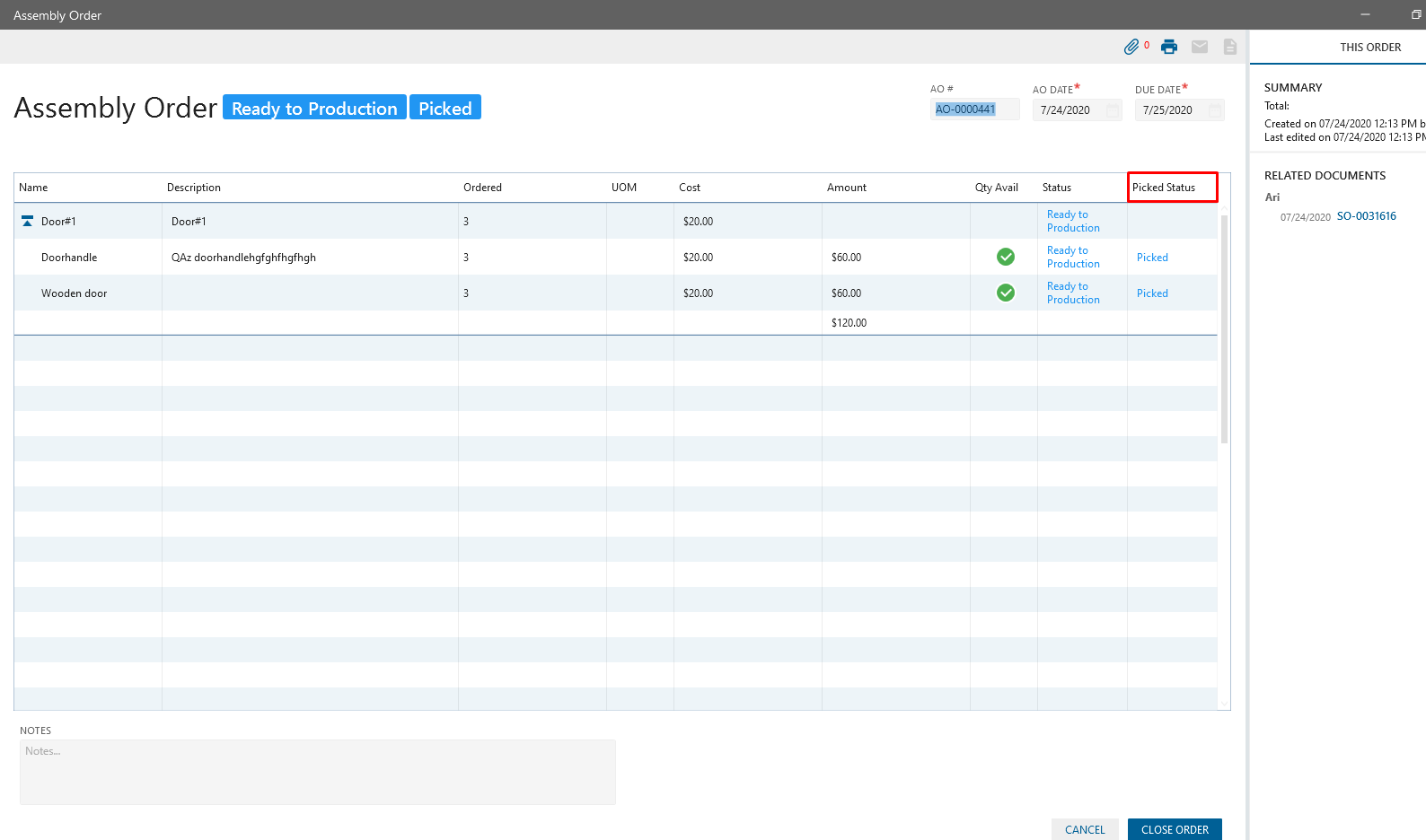 If Item is picked then Pick Status is displayed in related AO. To get PDF file with picked Items User can from Pick Item panel and AO
