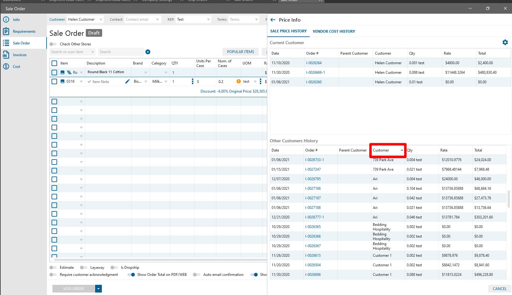Added ability to sort Customer column by Parent Customer and then by Customer on the Price Info panel -> Other Customers History