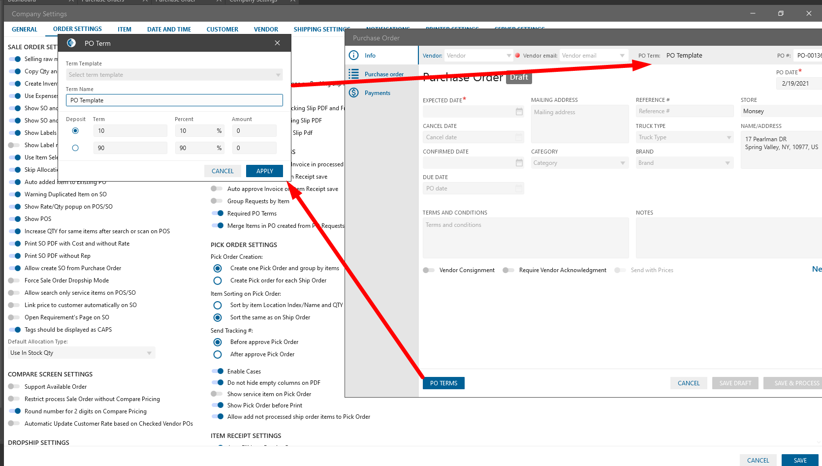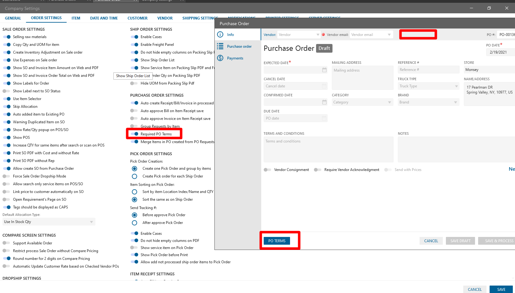 User is able to set option “Required PO Terms” on the Company Setting panel to manage PO Terms on the PO edit form