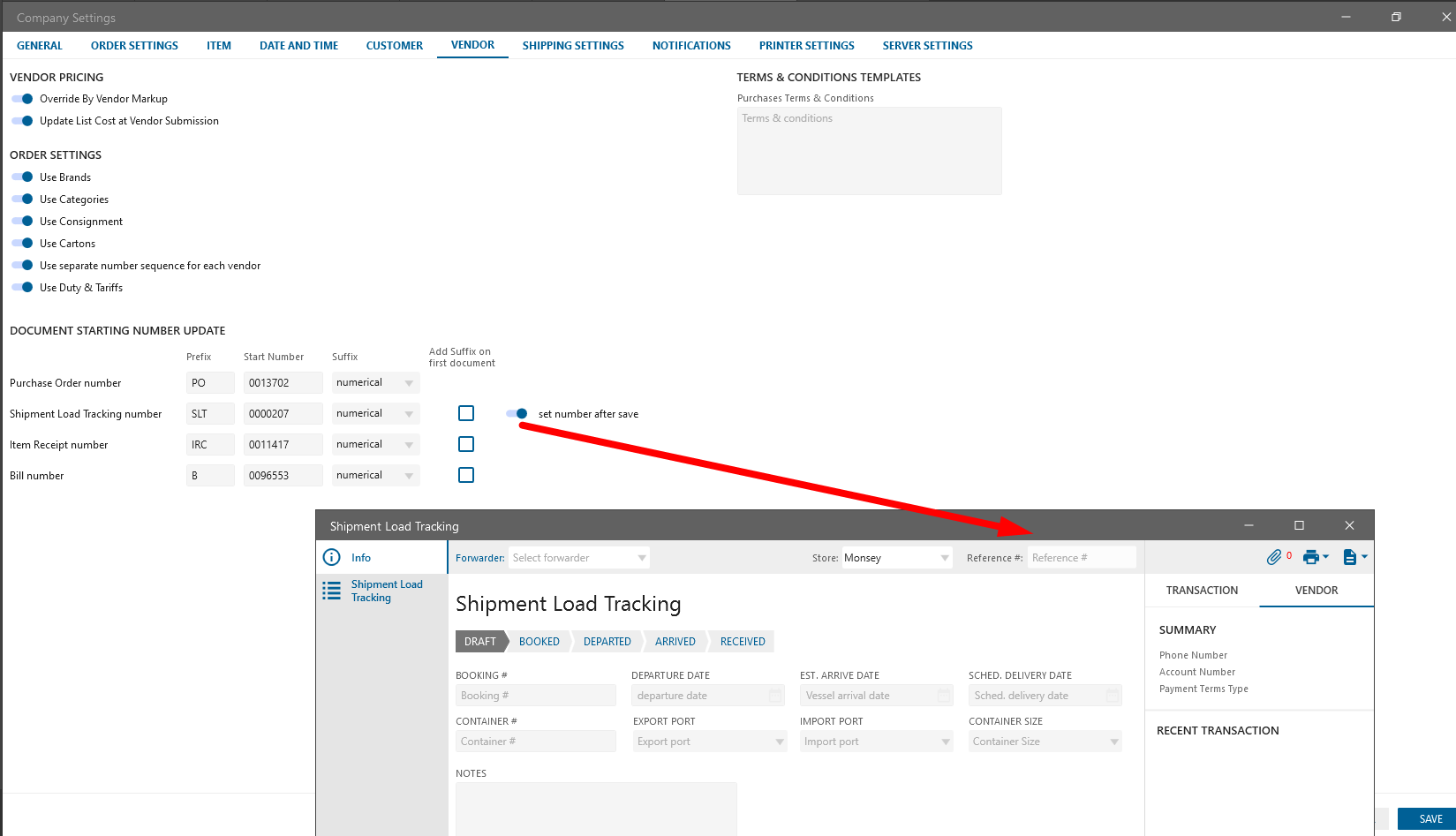 For this ability added Setting for SLT number – “set number after save” . Path: Company Settings -> Vendor -> Document Starting Number update