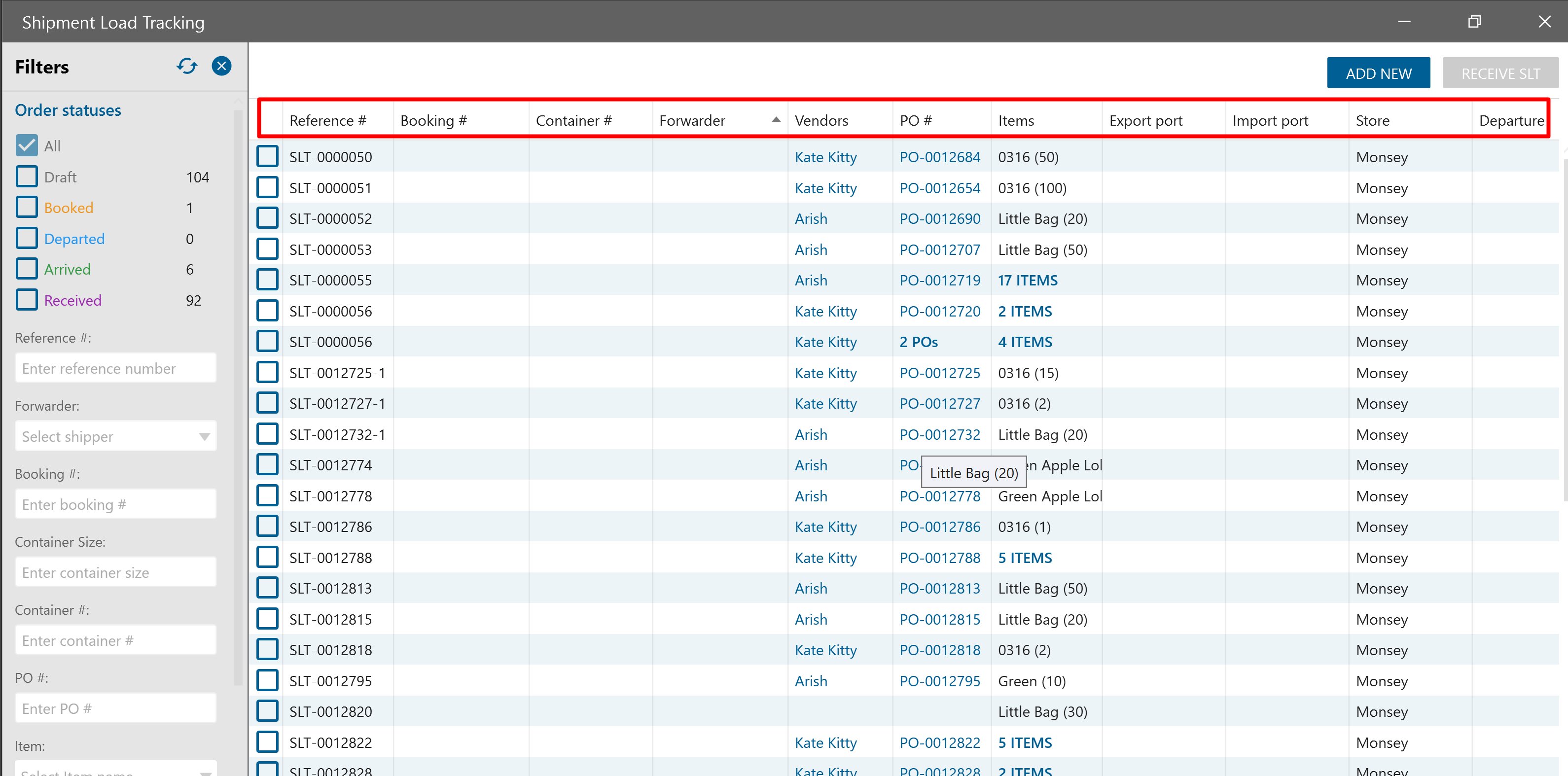 All fields except Status/Items/PO/Vendors are sortable on SLT list form.