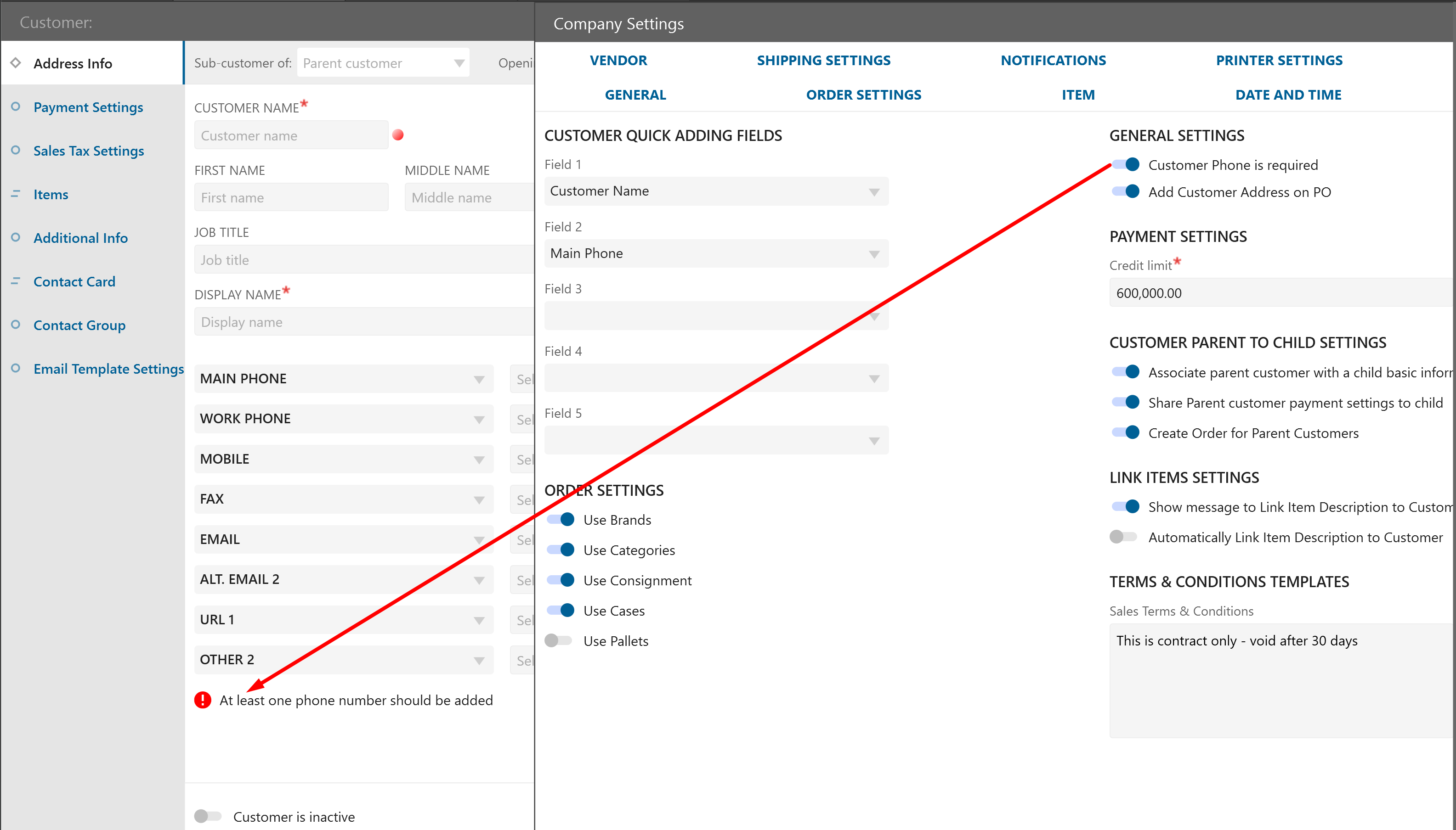 - if in company settingsĀ “Customer Phone is required” checkbox is checked and no one phone was added to the customer: