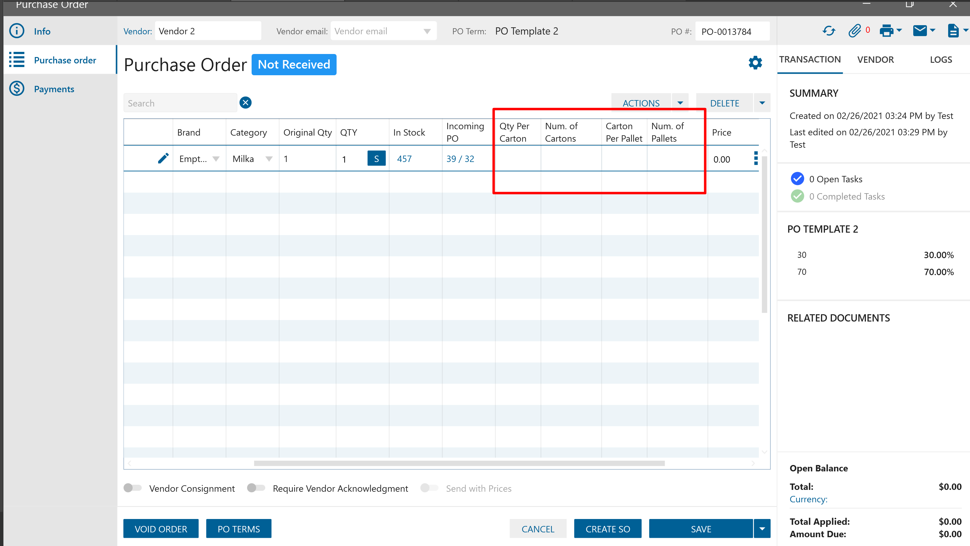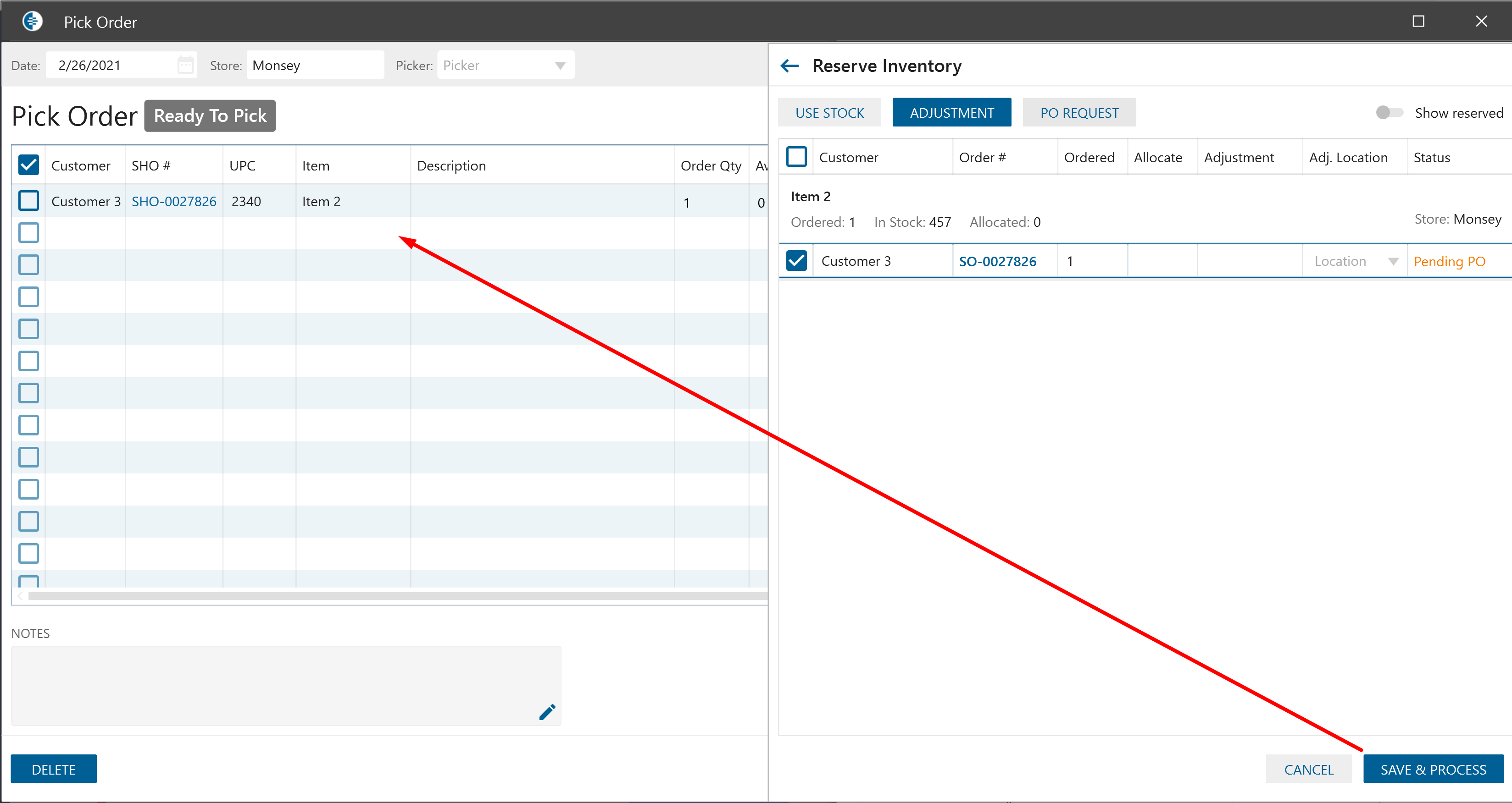 - If for line item on Pick order was selected “Create PO request” action and qty was not allocated from stock-> once “Save &Process” button was clicked -> line item should be displayed on pick order