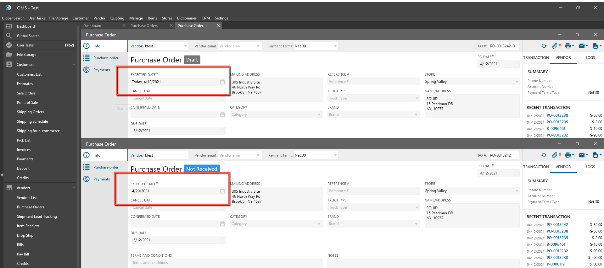 - Reopen PO, change PO Date → Save PO
