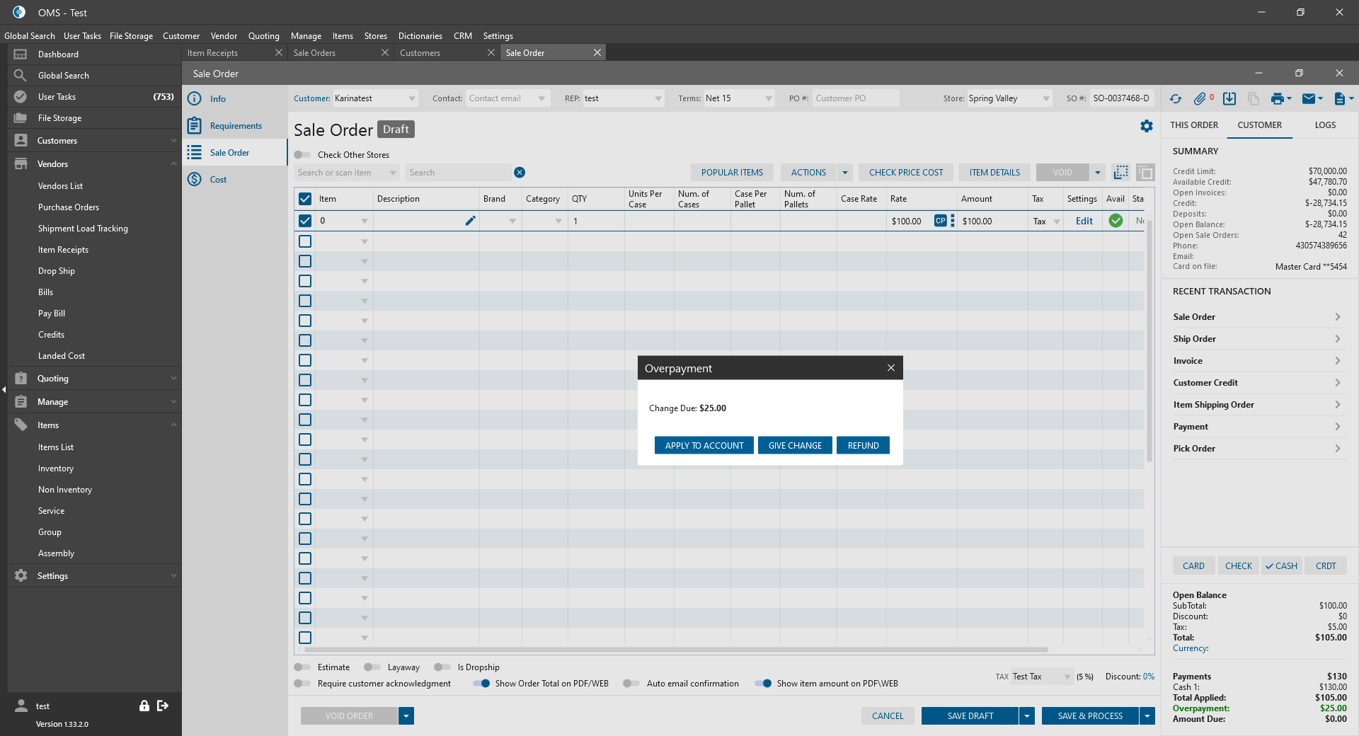- Create SO Amount = $100.00 -> Add Payment = $130.00;