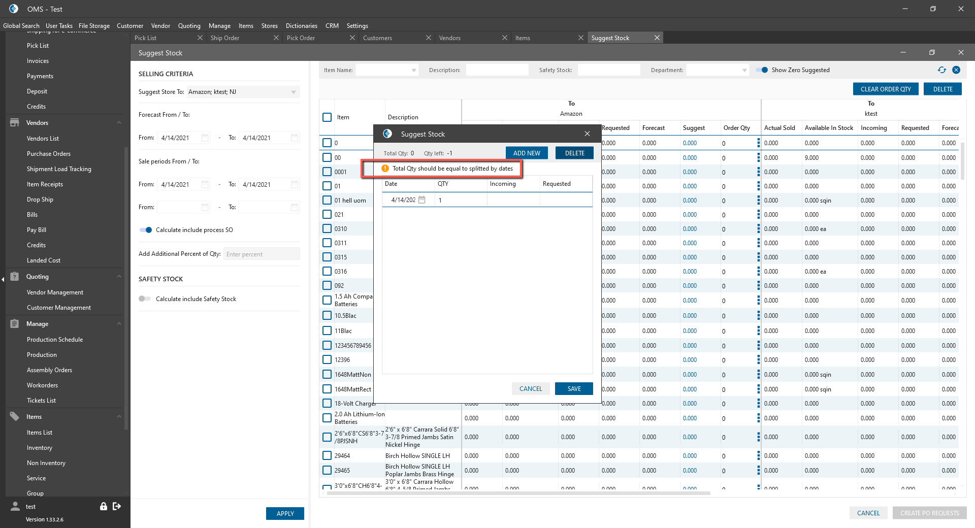 On Suggest Stock pop-up was added warning message “Total QTY should be equal to splitted by dates” when user change item QTY.