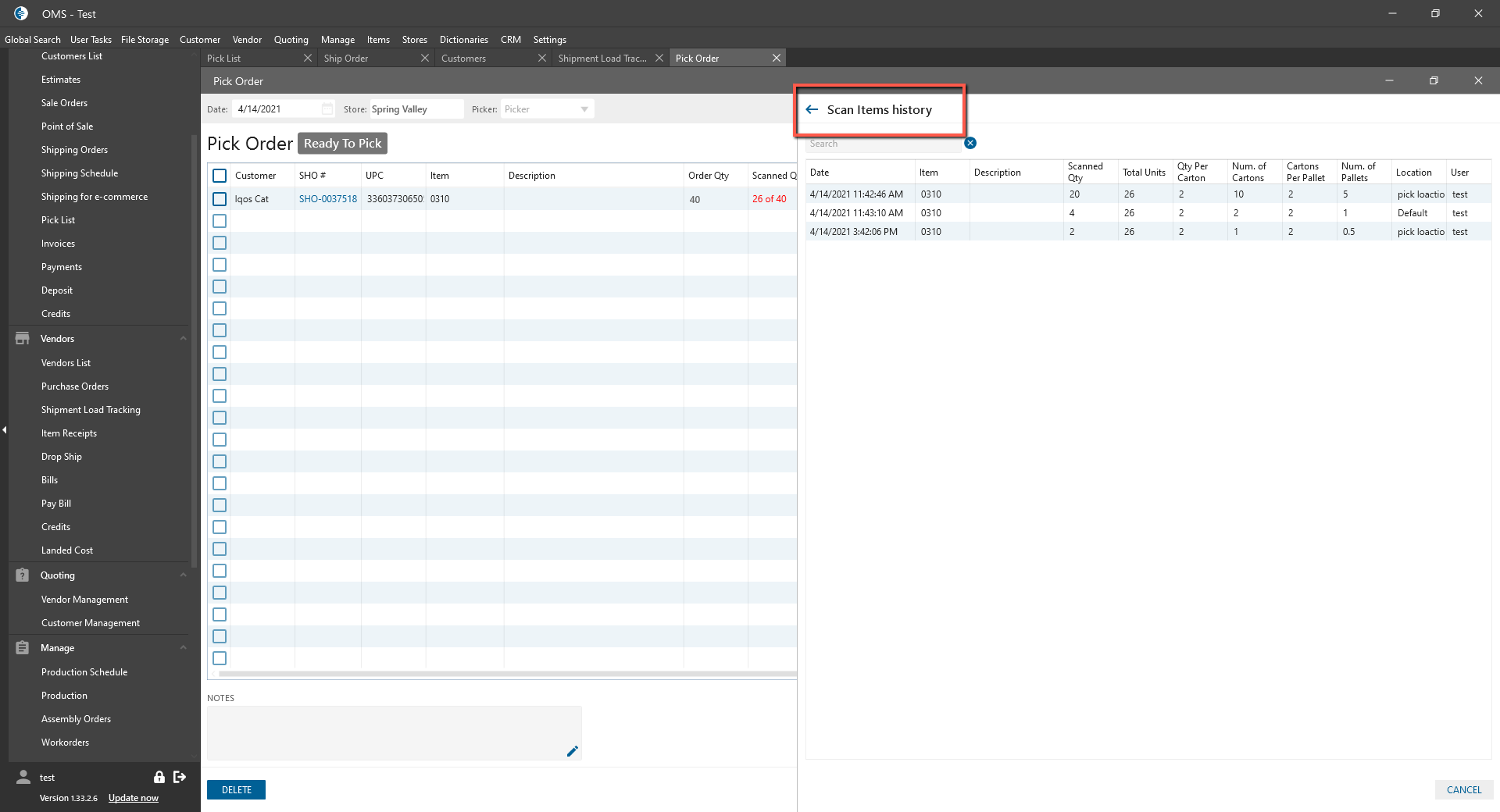 - Scan Item multibutton was added to the Pick Order for the ability to scan items. It contains two buttons: Scan Items/Scan Items History.