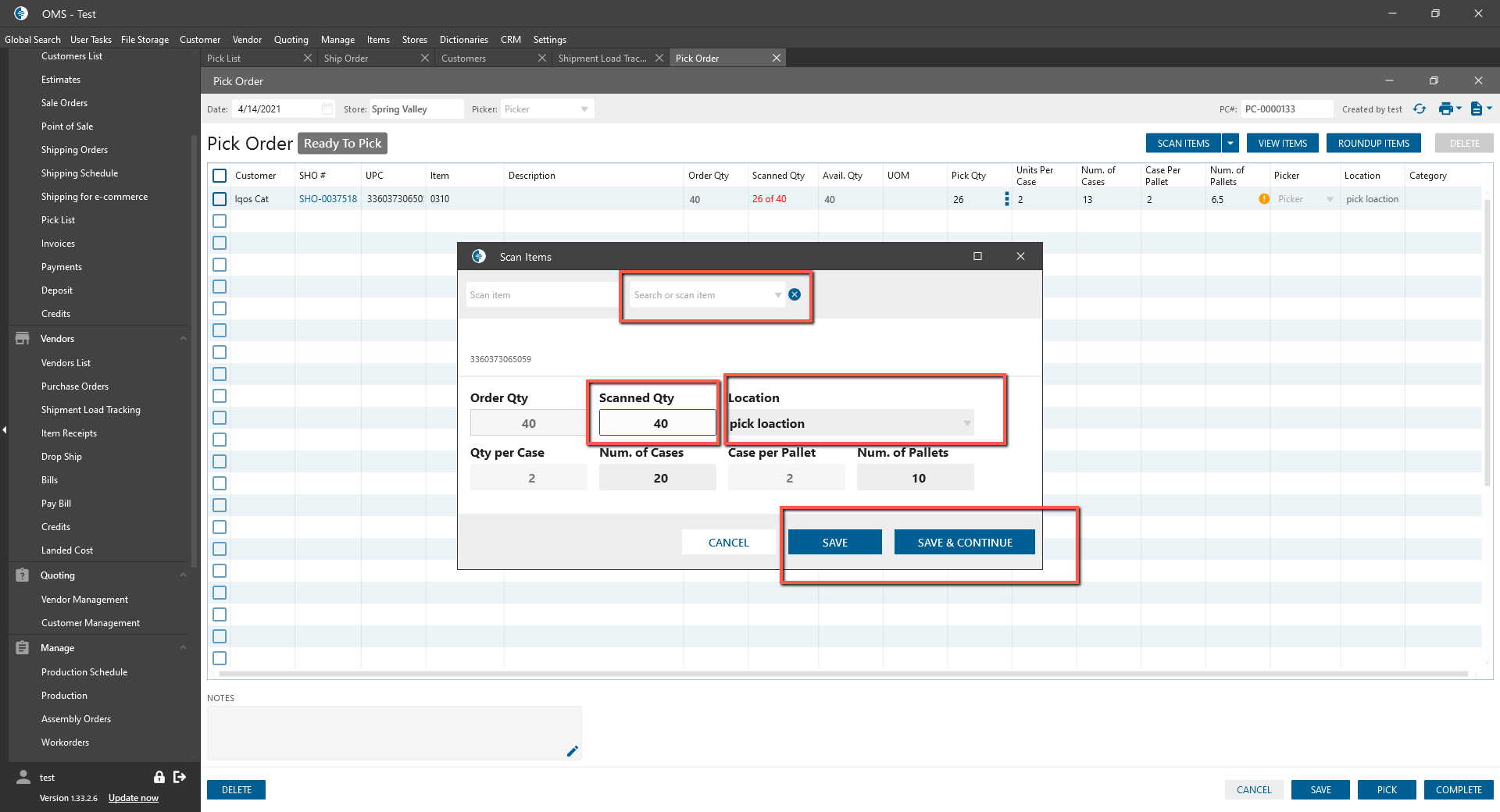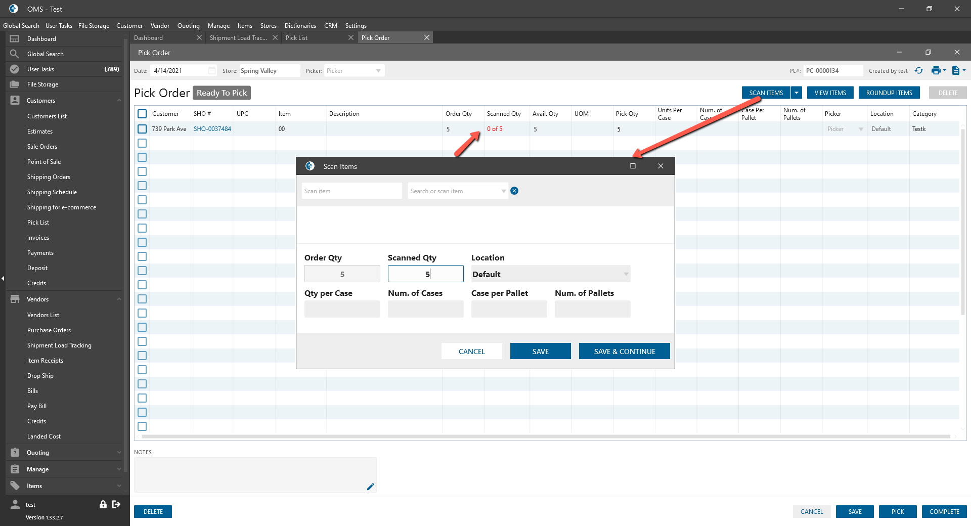 - Fill in Scanned QTY of item -> Click Save or Save & Continue button.