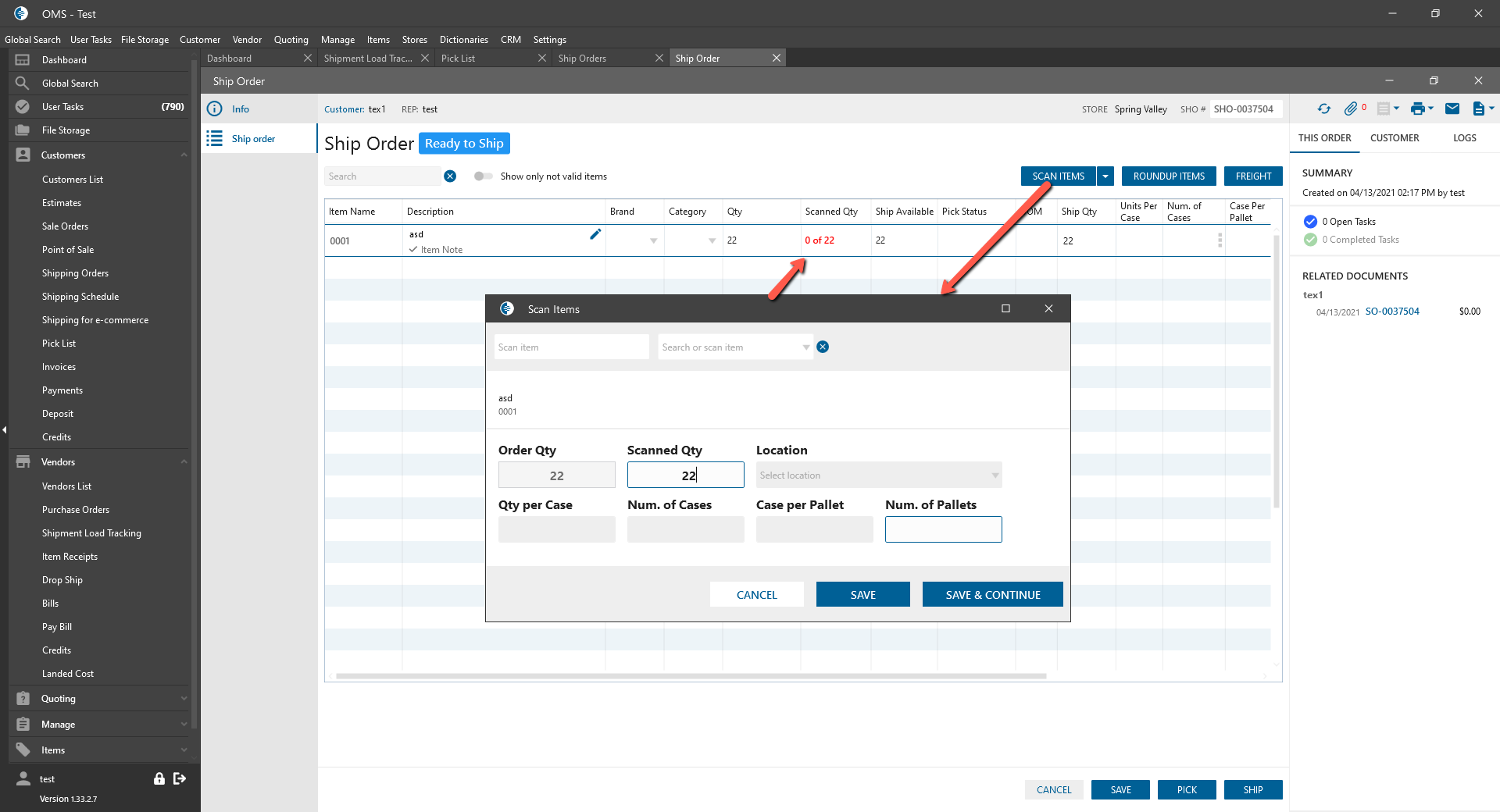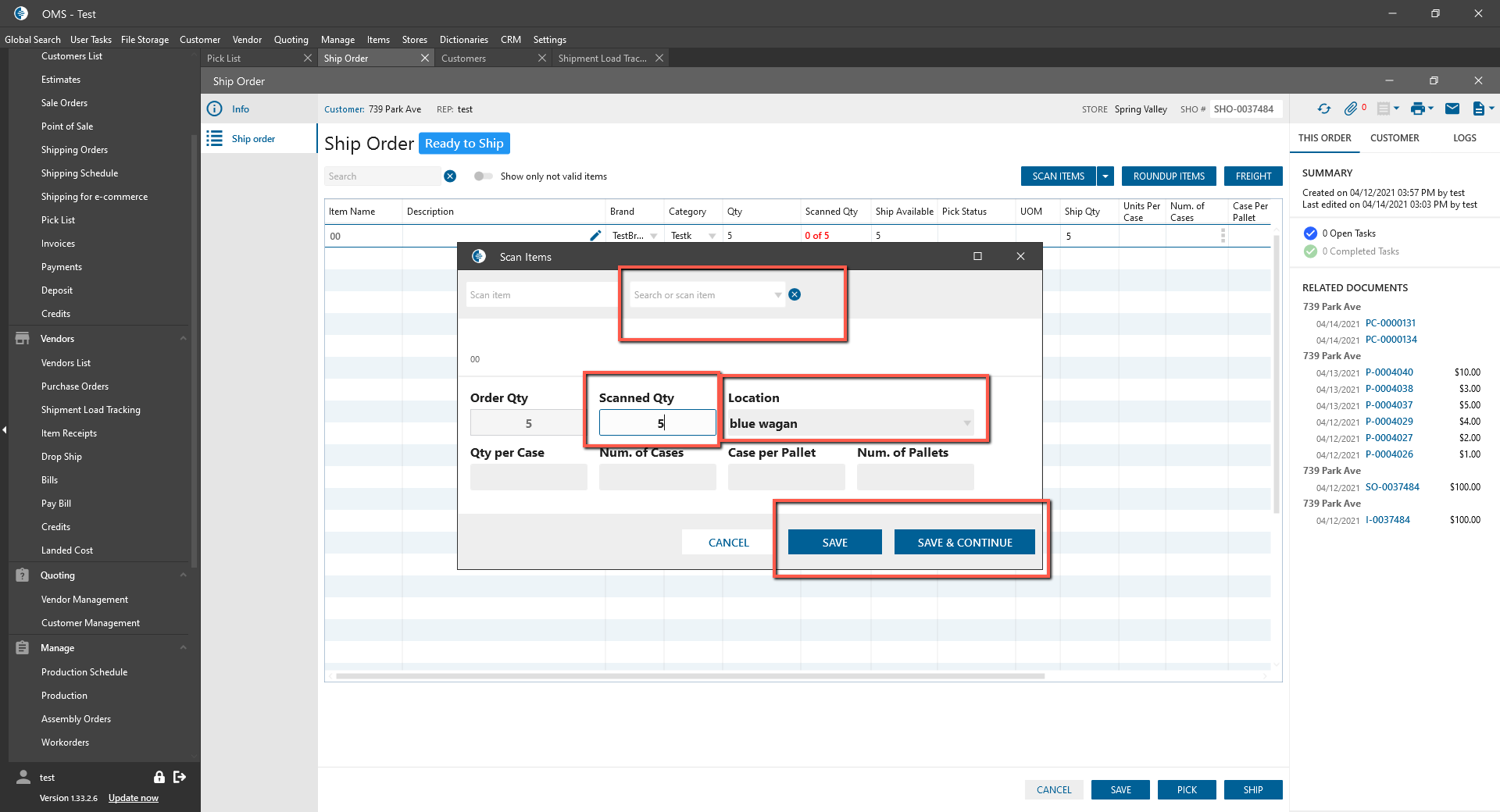 - Fill in Scanned QTY of item -> Click Save or Save & Continue button.