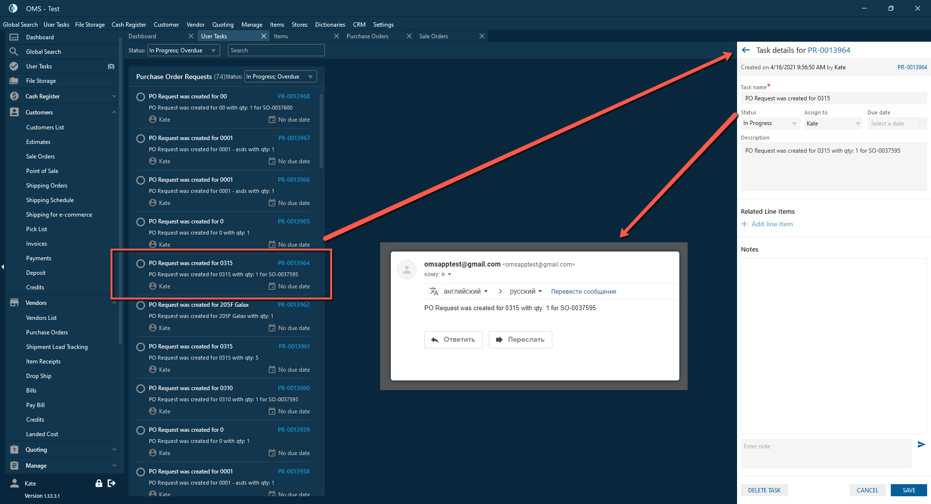 - if POR has related SO, the text is “PO Request was created for [Item Name] – [description] with qty: N for [SO-XXXXX]”.