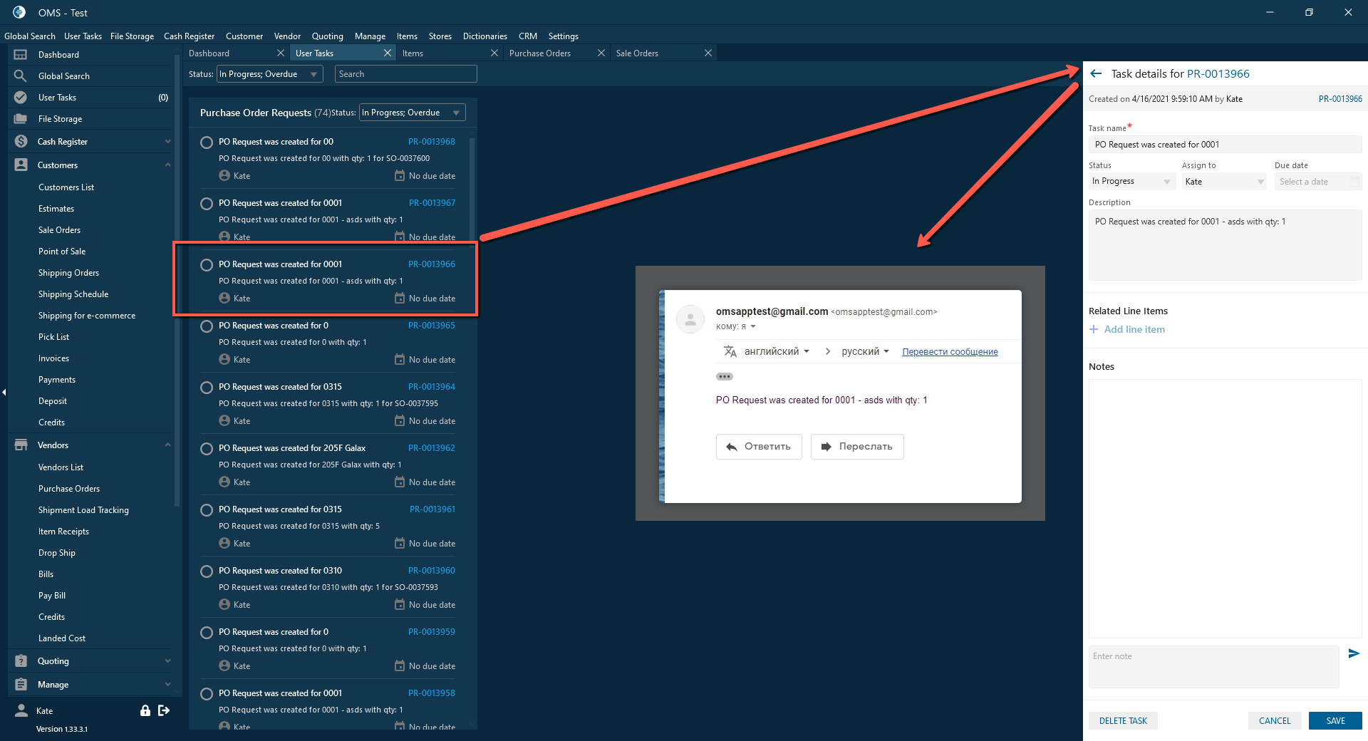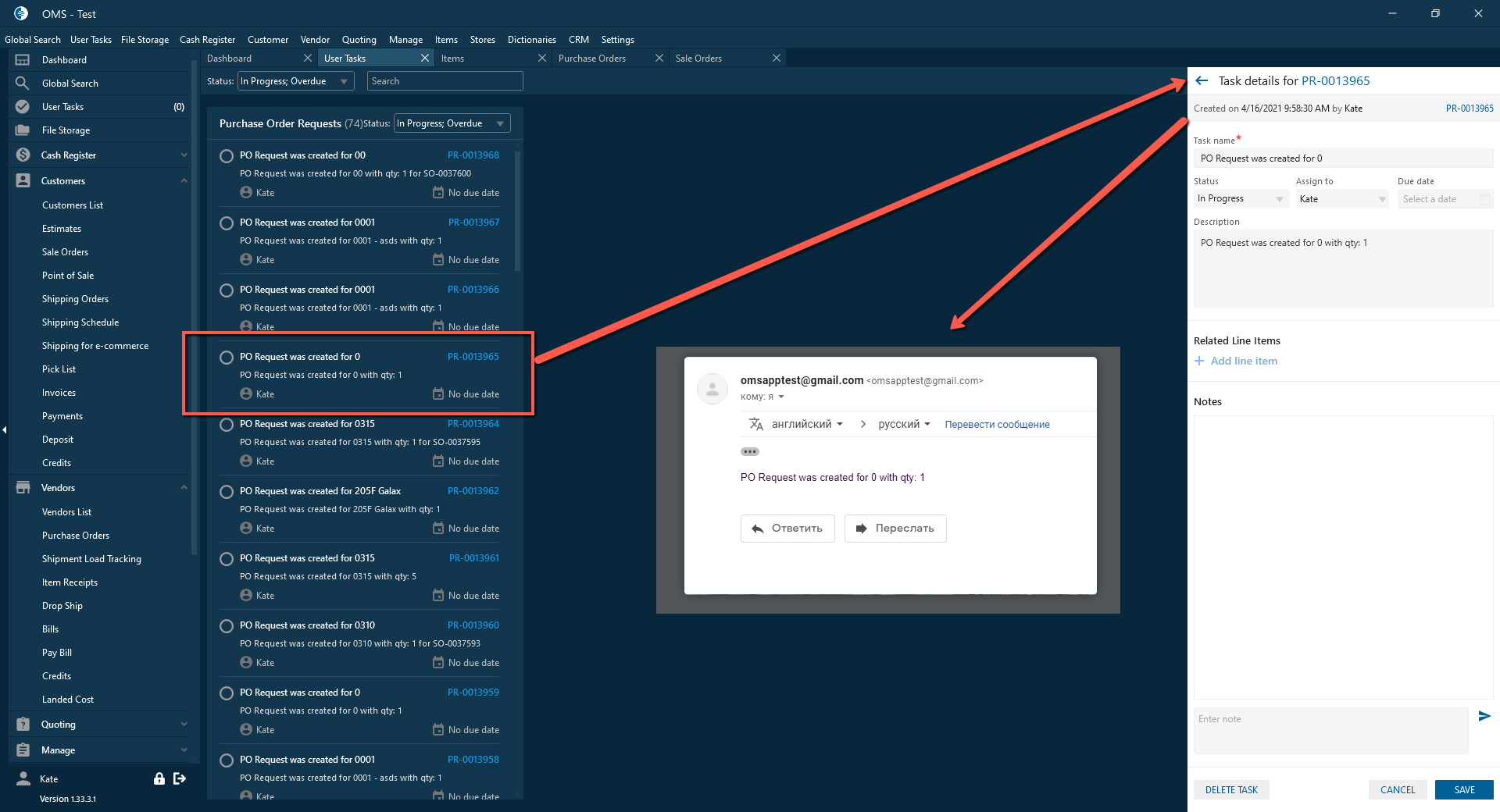 - “User to Notify” drop-down contains the list of active users in the system. If the checkbox is checked and the user is selected -> the email and task are created for the selected user.