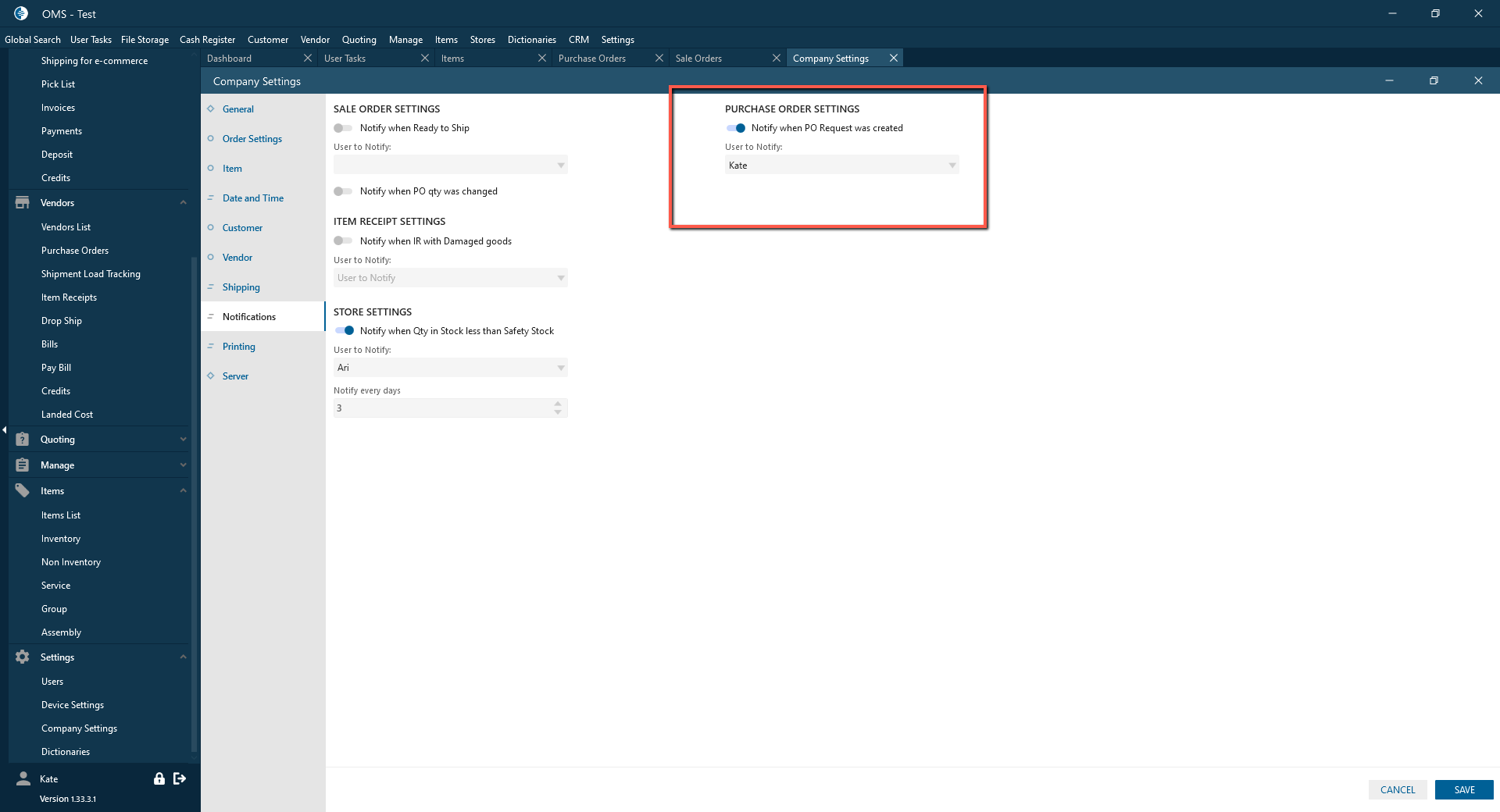 - “Notify when PO Request was created” checkbox. If the checkbox is checked, the “User to Notify” is enabled and required.