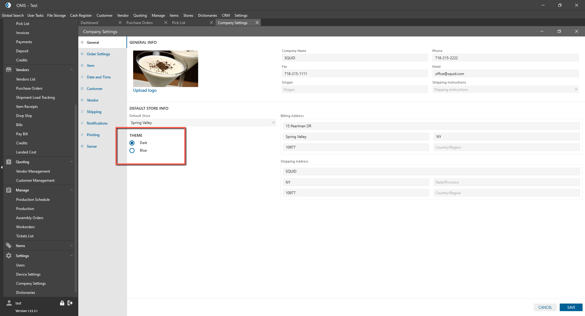 To Company Settings was added the ability to change theme colors for backdrop. It can help users to see what OMS they are on.