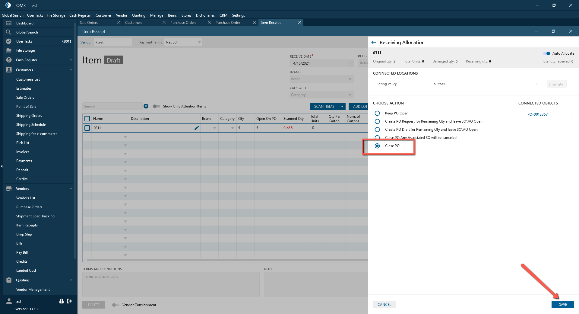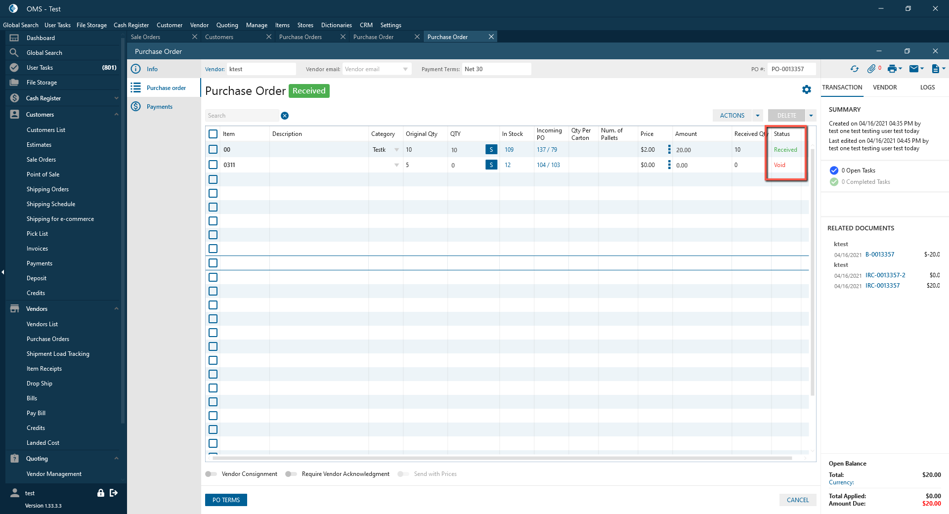 - Create PO -> add 2 items -> Click Save & Receipt;