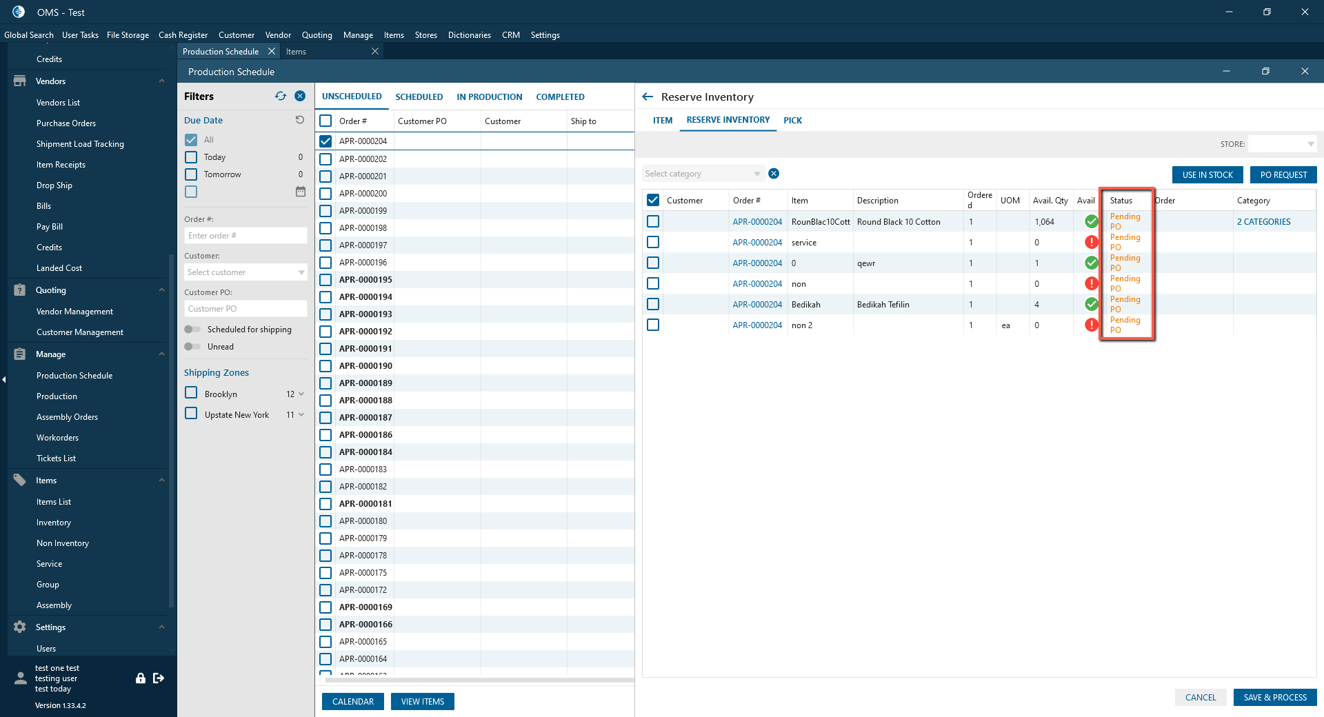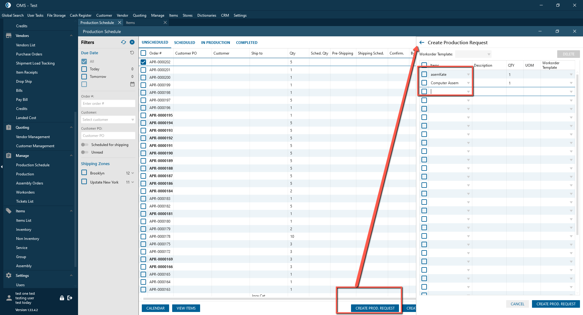 - Create Production Request -> Add Assembly item with BOM item type service;