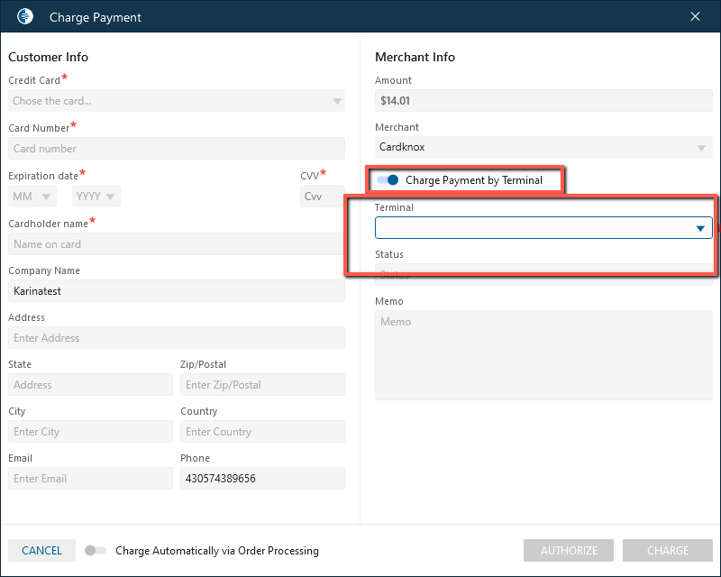 - Charge Payment by terminal checkbox which isn’t check by default. If the checkbox is checked -> the Terminal drop-down is enabled and required;