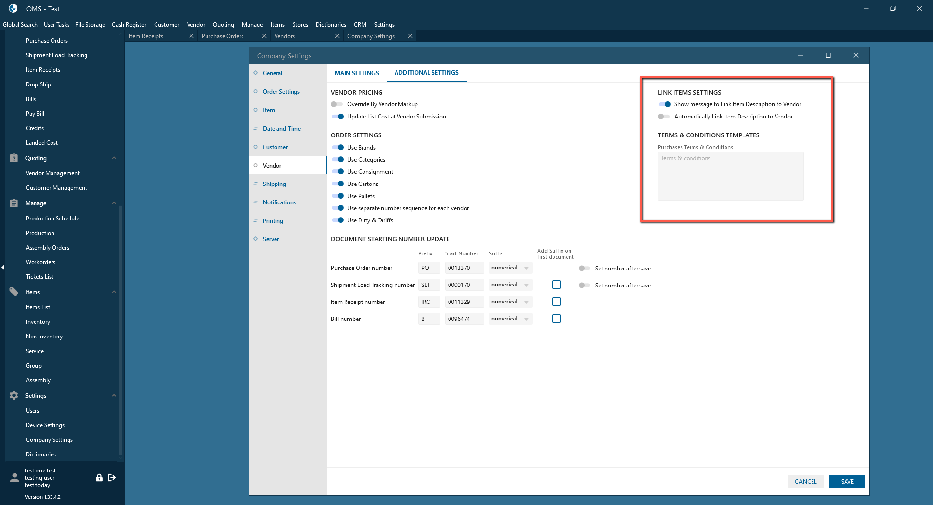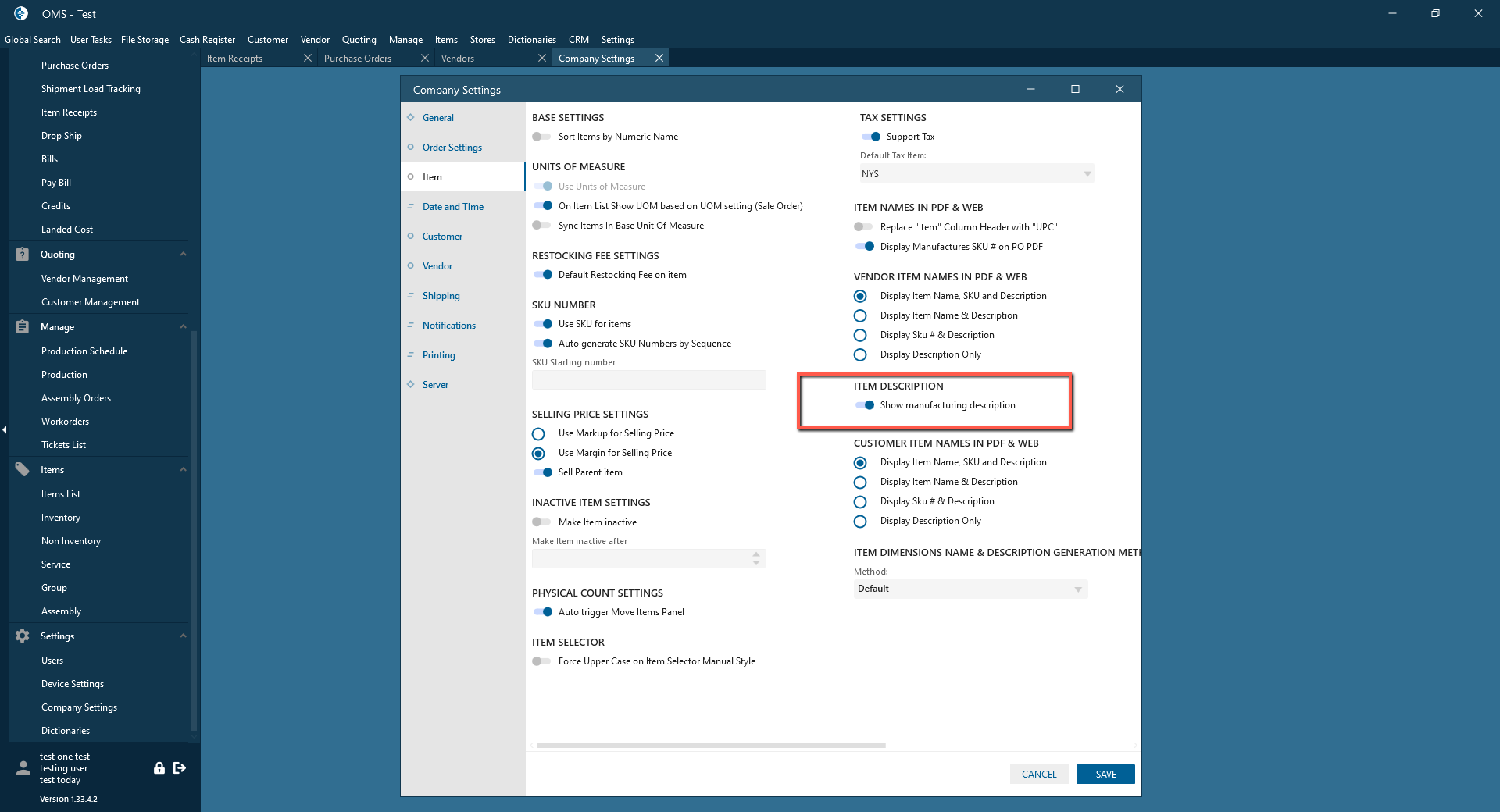 - “Show manufacturing description” checkbox. If checkbox is checked -> the item Custom description is displayed on: PO order/PDF/Web, SLT order/PDF, IR order/PDF, Item Shipping Order, Bills Order/PDF, Vendor Credit Order/PDF;