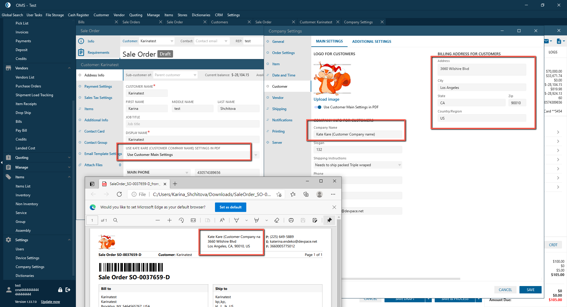 - “Use [Customer Company name] setting in PDF” label and drop-down contains 3 options: