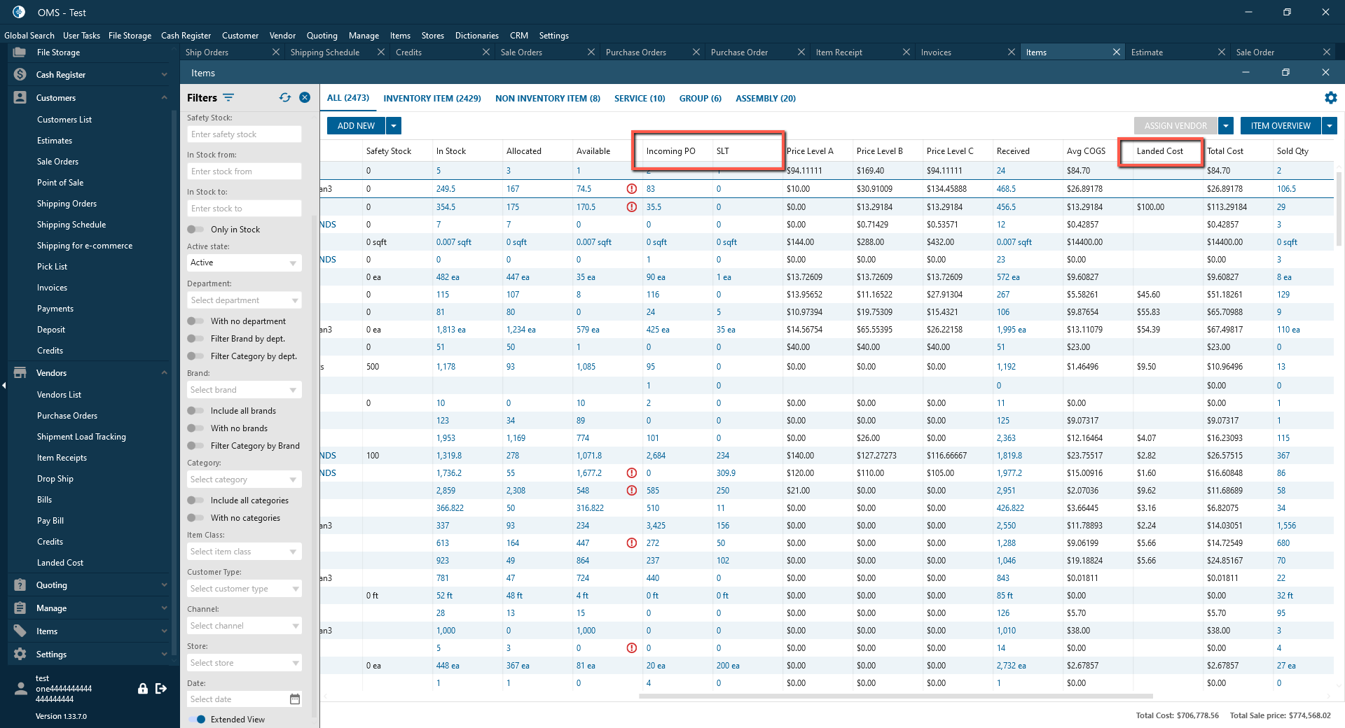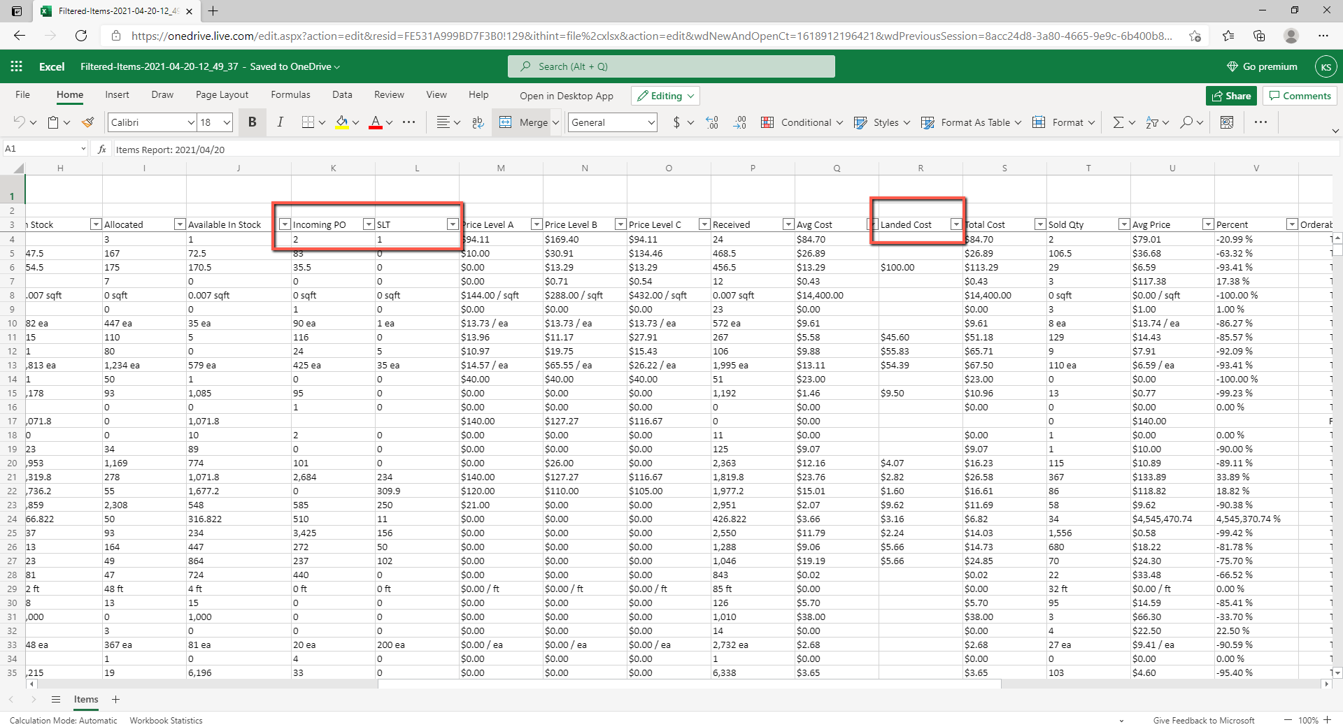 After clicking on Extended View checkbox, Incoming PO, SLT and Landed Cost columns are displayed and can be export to excel.