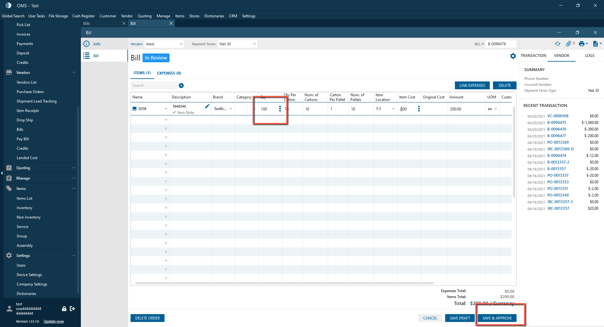 - Create Bill → add item → set QTY = 100 → save&approve;