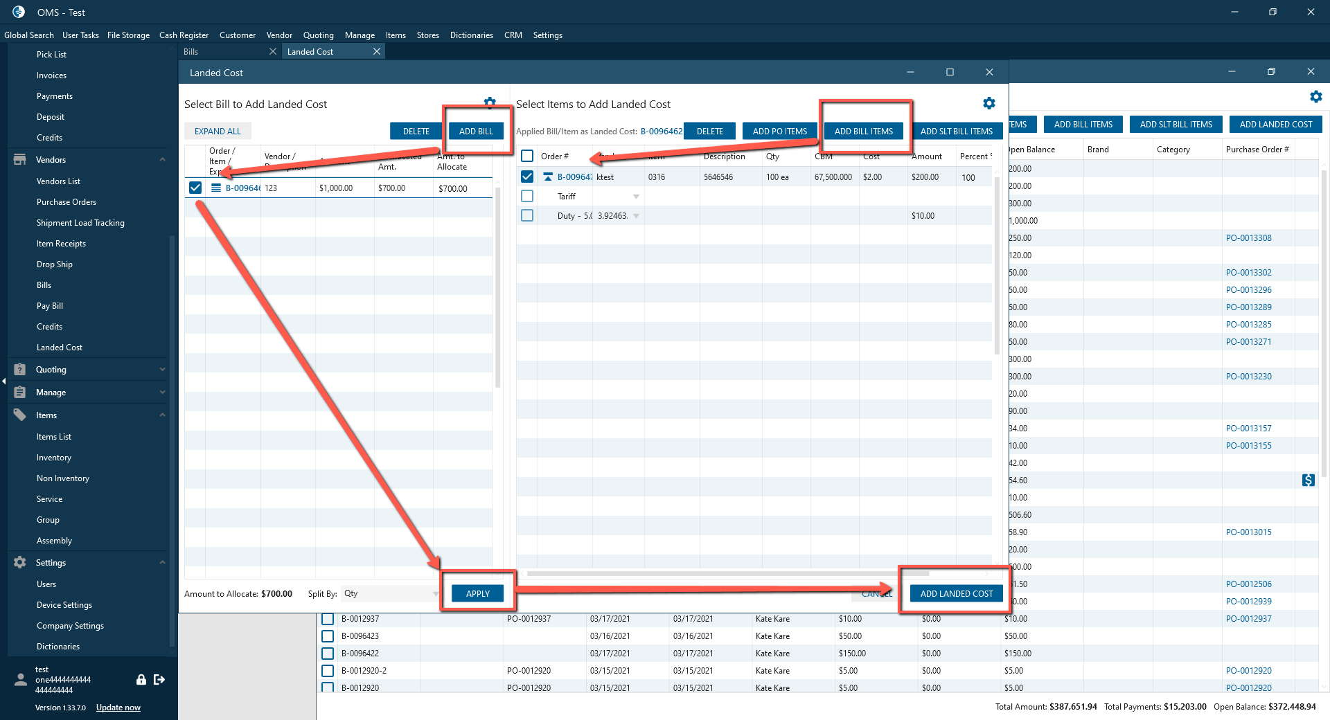 - Landed cost → press “add bill items” → add created Bill to right bar;