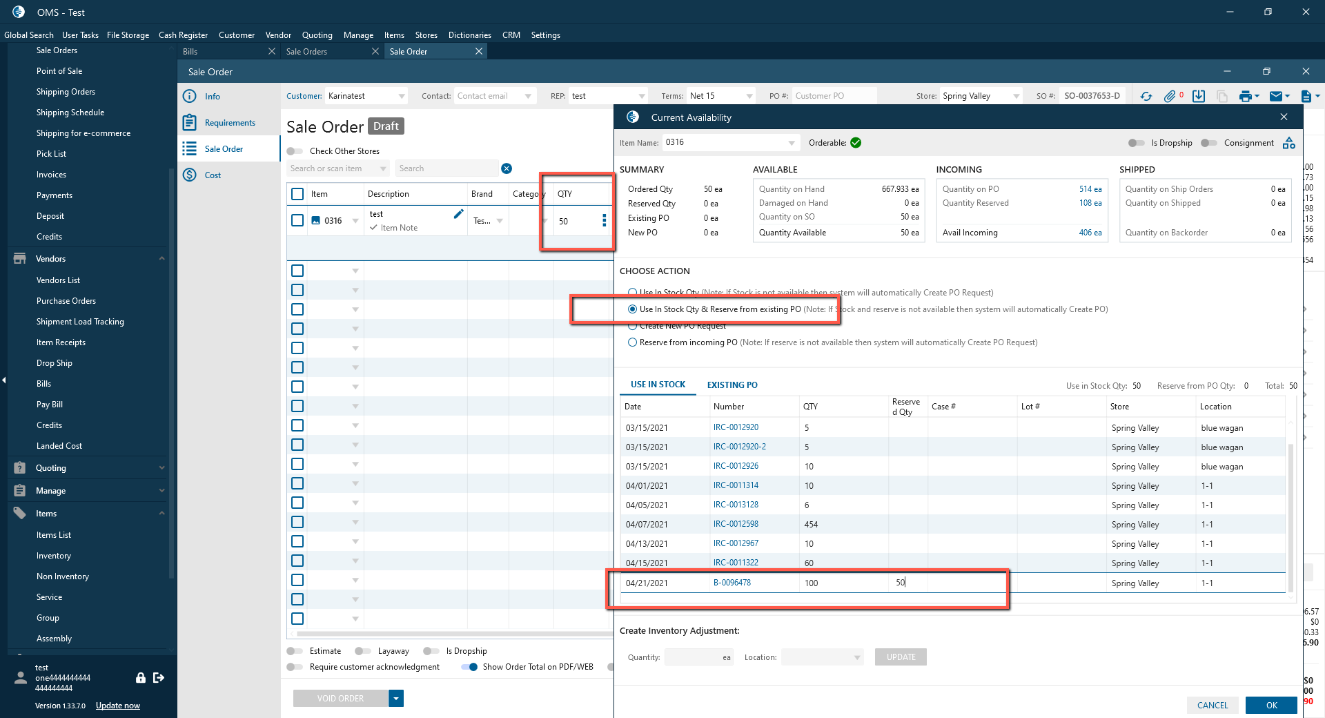 - Current availability → Use in stock & receive from existing PO → select created Bill → enter reserved QTY =50 → OK → process SO;