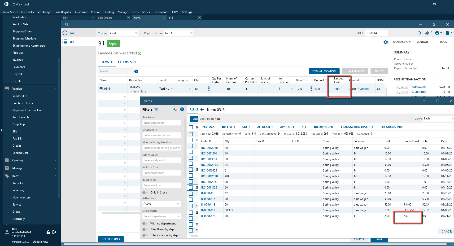 The landed cost is matched with item list in Stock/Location Info tabs and Landed cost at Bill edit.