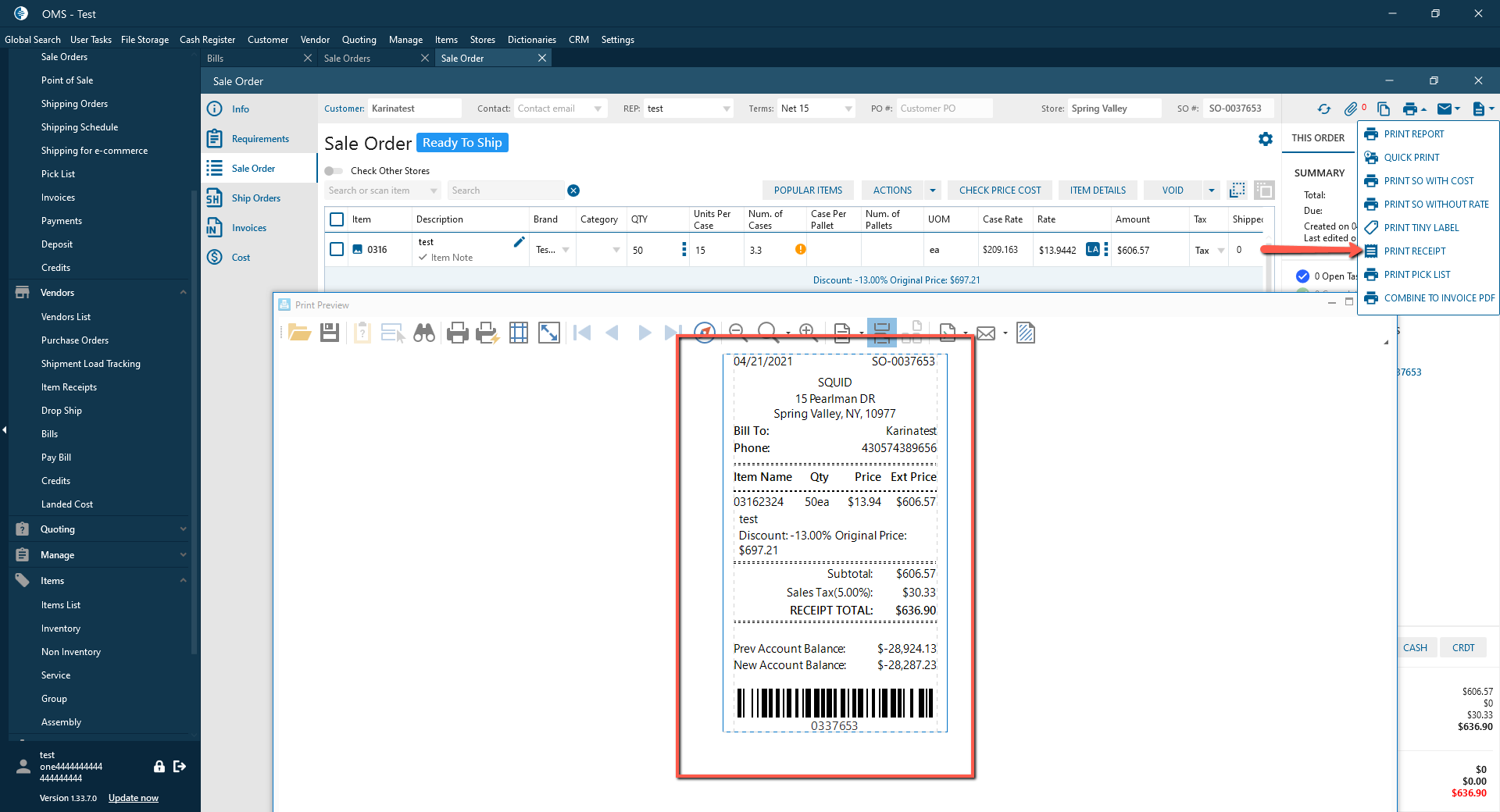 When user clicks on Print Receipt in Print multi-button on SO, he generates a sales receipt, which clearly shows all the information. Previously, the right column was slightly trimmed.