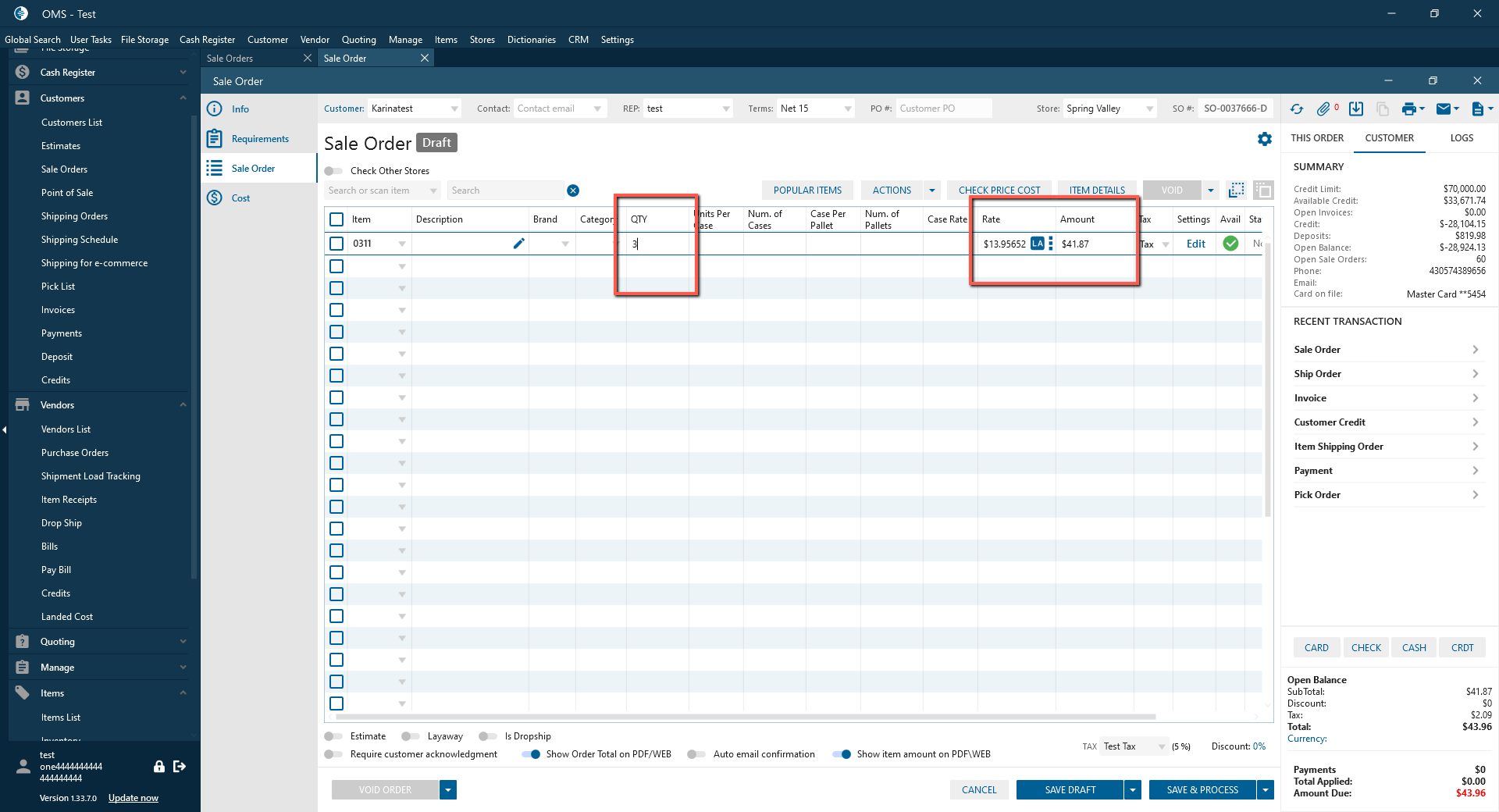 When user adds to SO item with QTY>1 and Rate -> Amount = QTY * Rate.