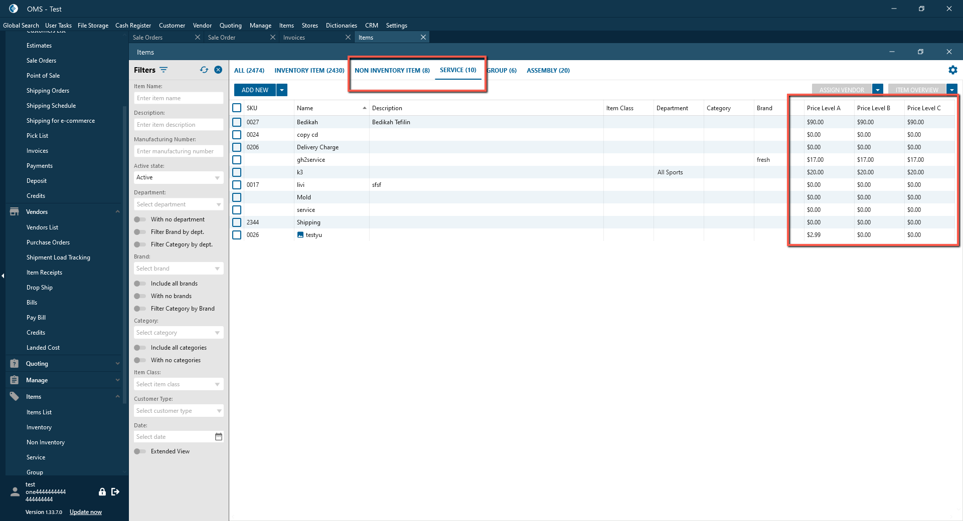 And to Non inventory/Service items tabs were added Price level A/B/C columns.
