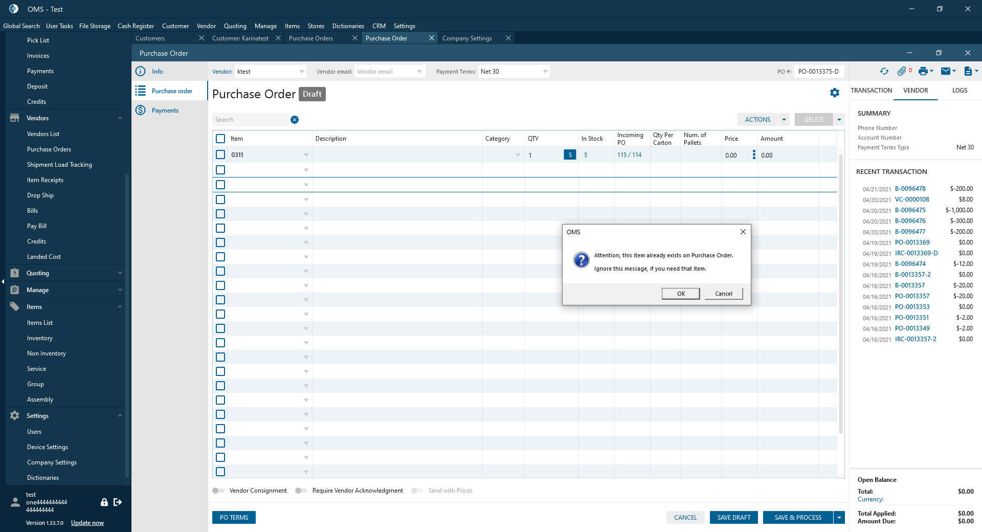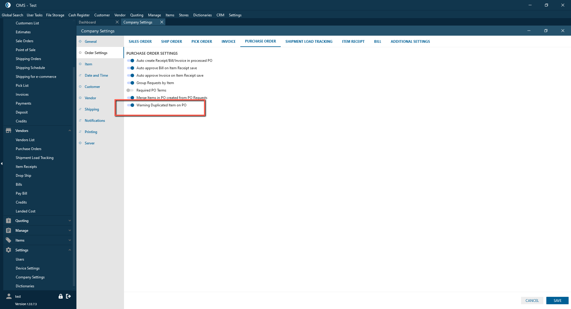 To Company Settings was added “Warning Duplicated items on PO” checkbox.