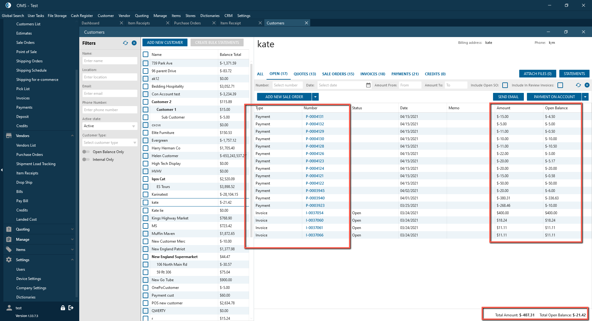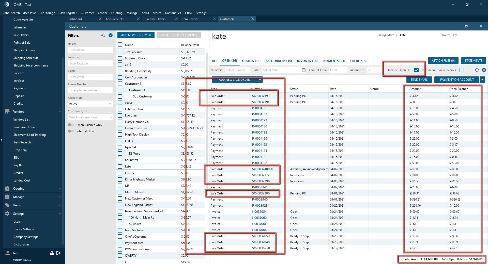When user check Include Open SO checkbox on Open tab on Customer screen – Total Amount and Total Open Balance calculate including Open SO.
