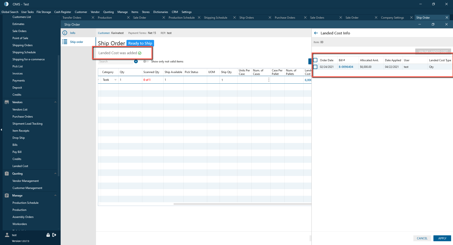 If landed cost was added to the item on SHO -> Landed cost column is added to the SHO and label “Landed Cost was added” is displayed.