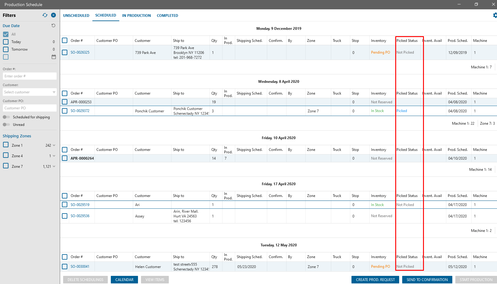 Added on the Production Schedule screen Picked status column