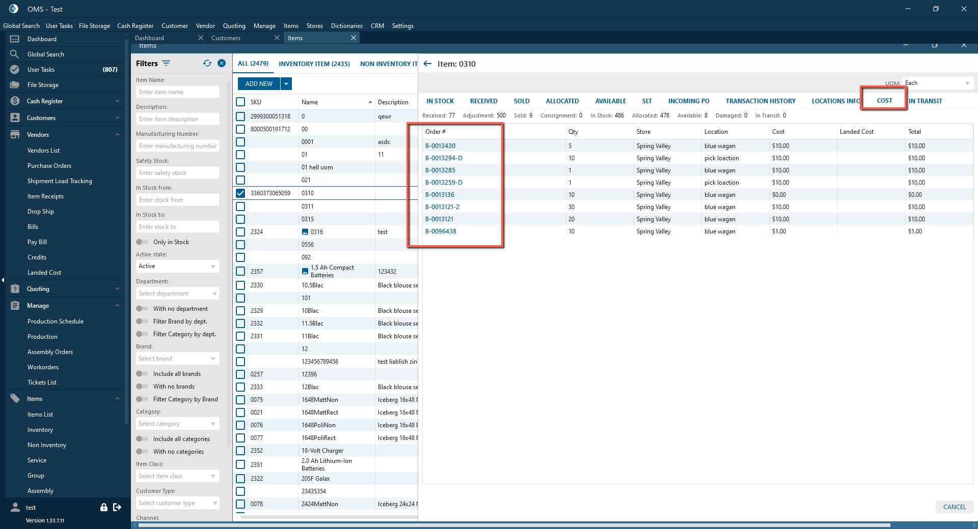 - Click on In Stock/Allocated/Available value of random item -> Item statistic is opened;