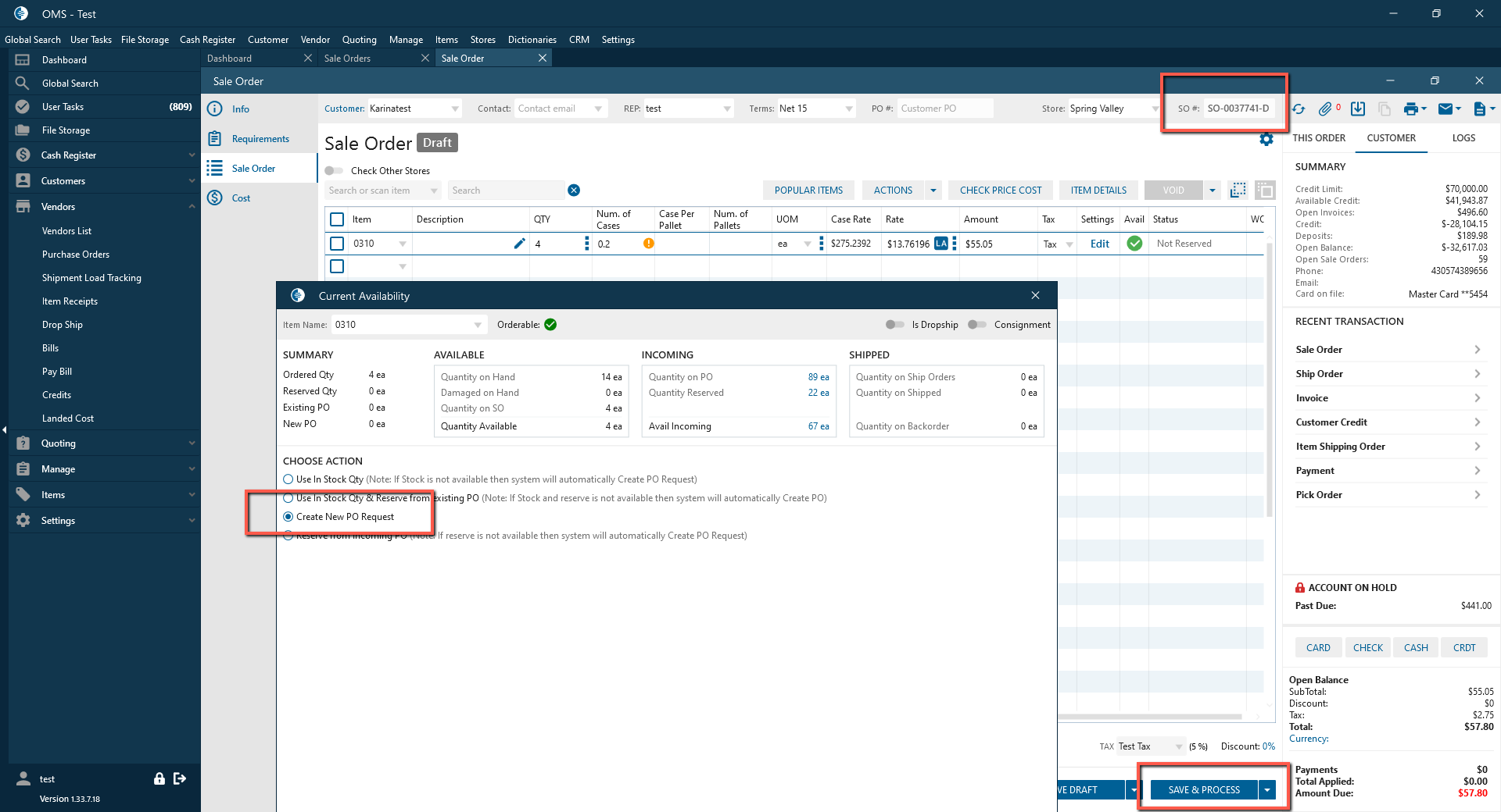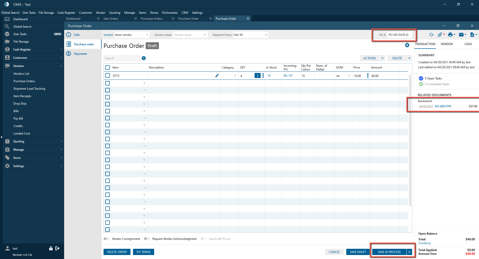 - Open PO request tab and select created request -> Click on Create PO -> Save & Process;