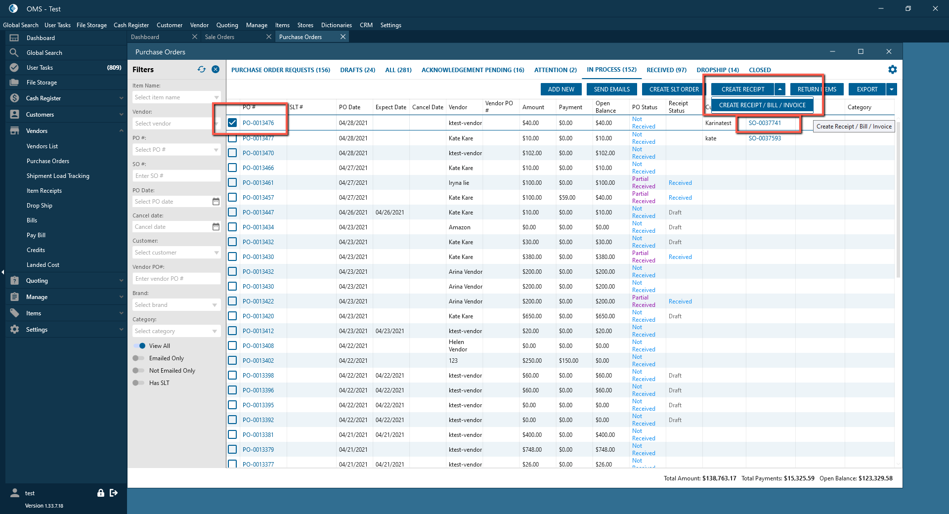 - Select PO on In Process PO tab -> Click on Create Receipt/Bill/Invoice button;