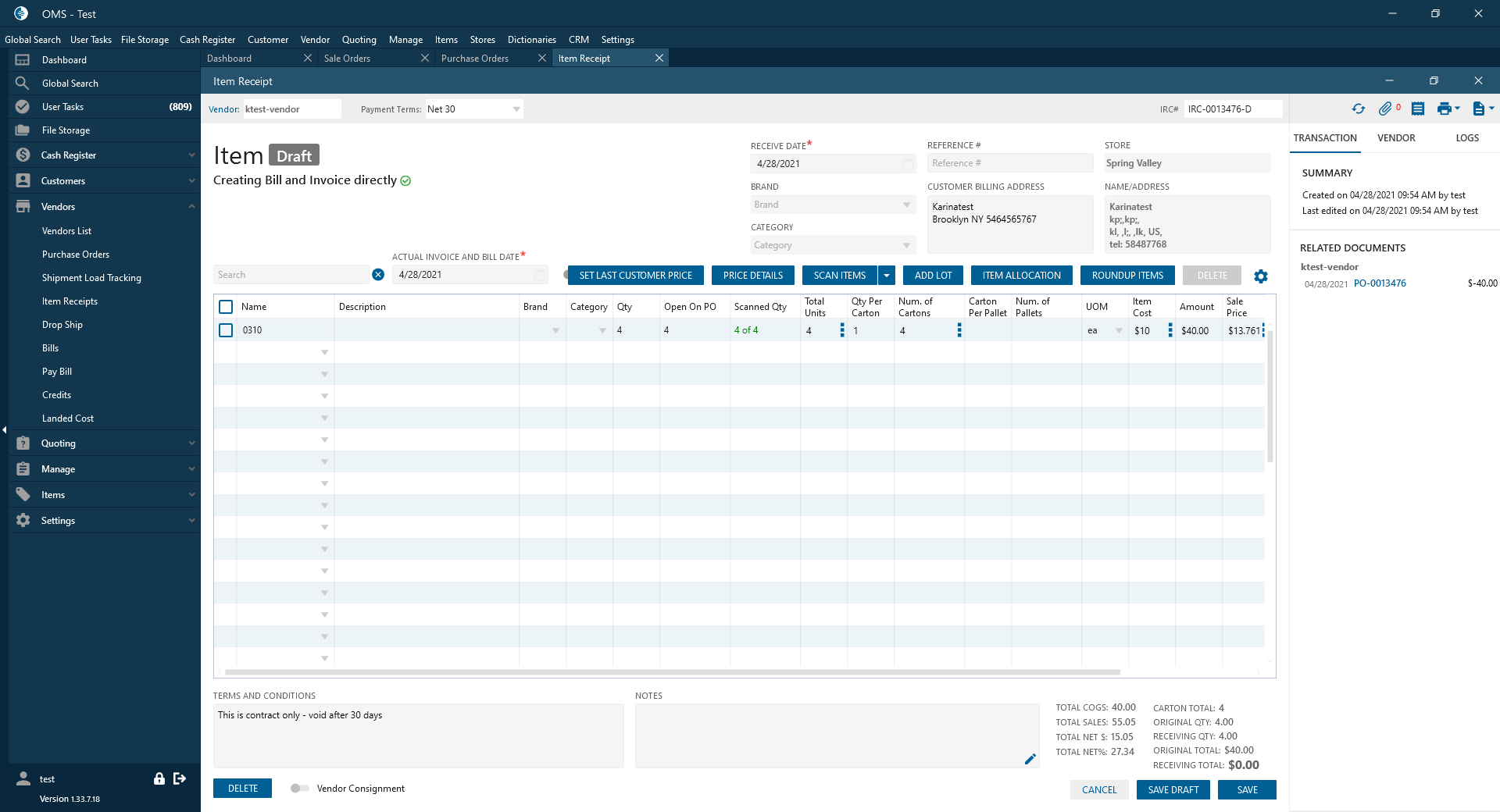 - Create Item Receipt -> Save;