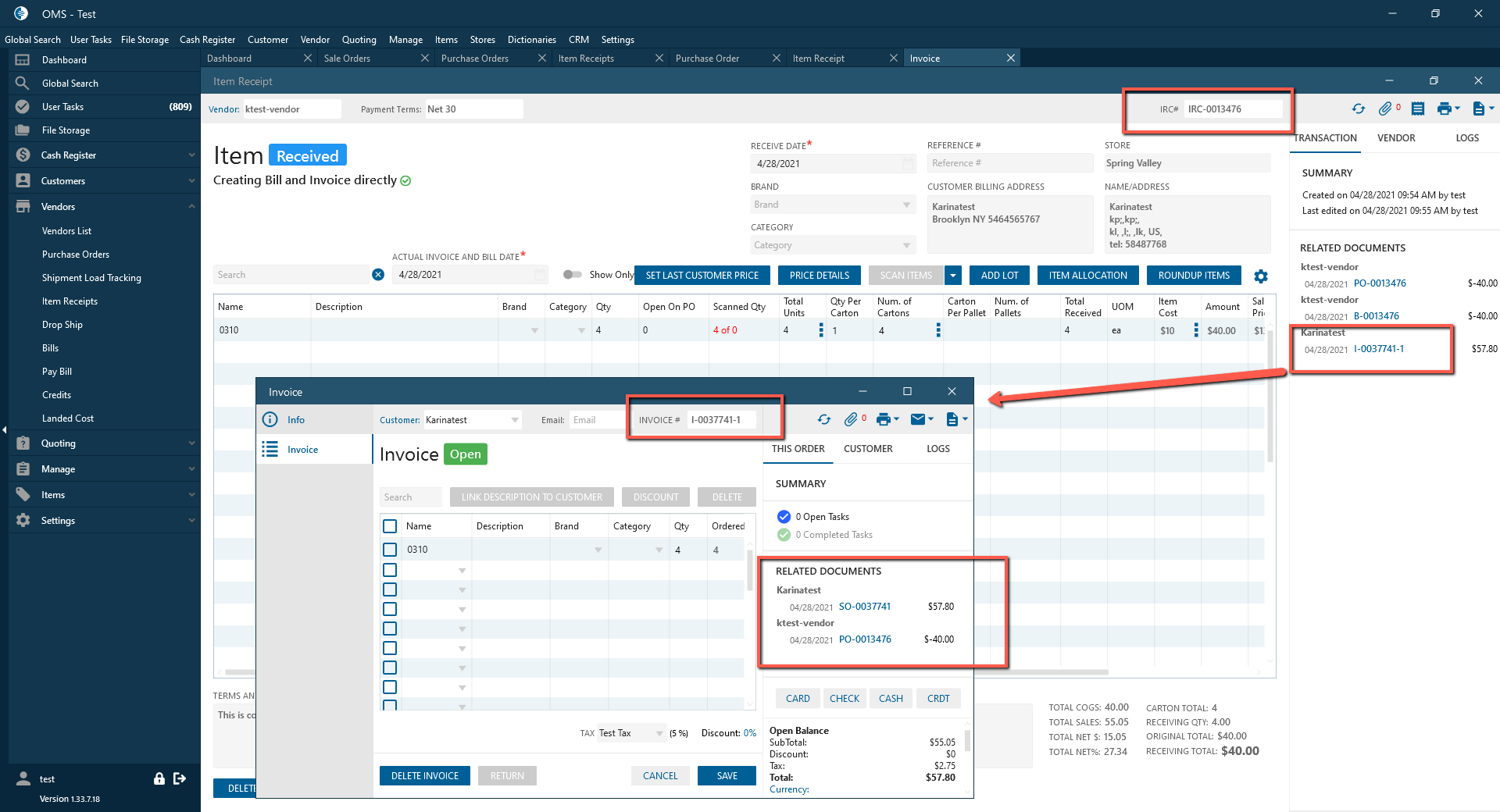 - Open PO Item Receipt tab -> Select IRC in Recent transaction -> In Related Documents in IRC is displayed Invoice.