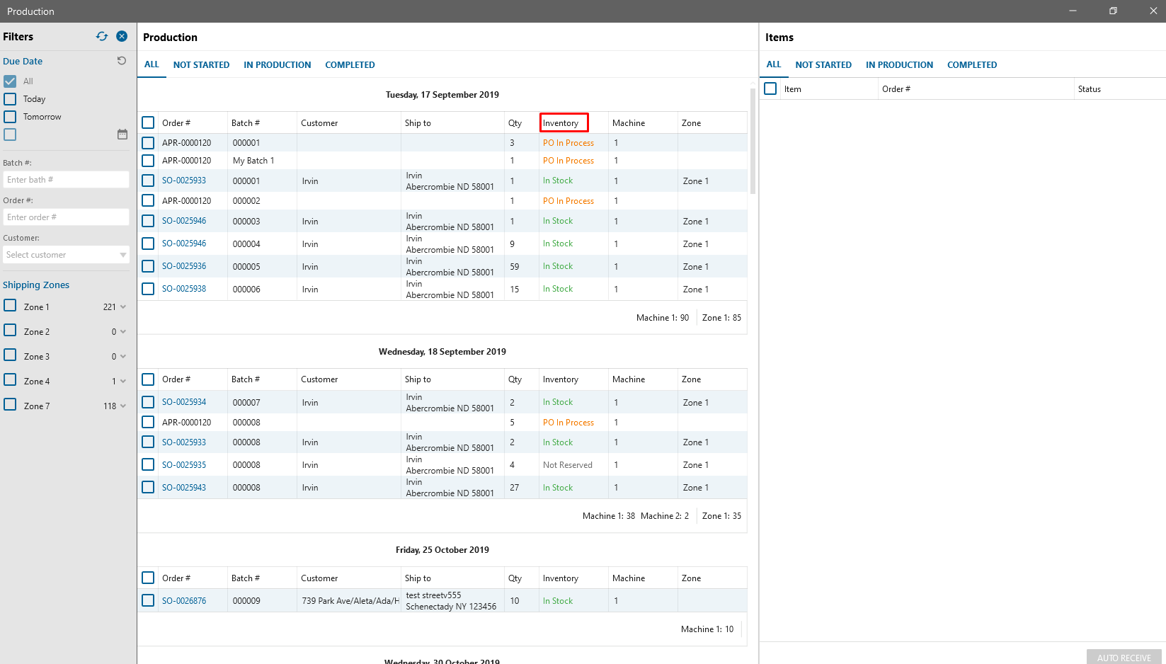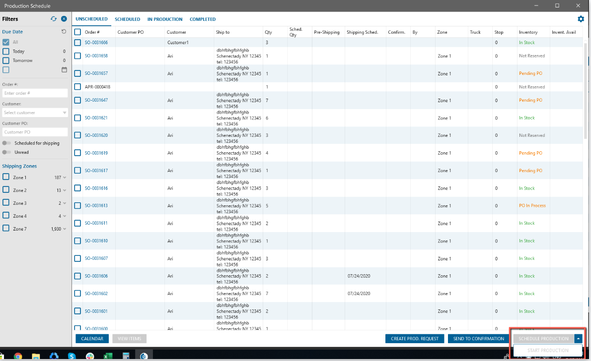 - if was checked order with not reserved item then after clicking on the “Start Production” button the message will be displayed: “Production could not be started for orders which have not reserved items.”