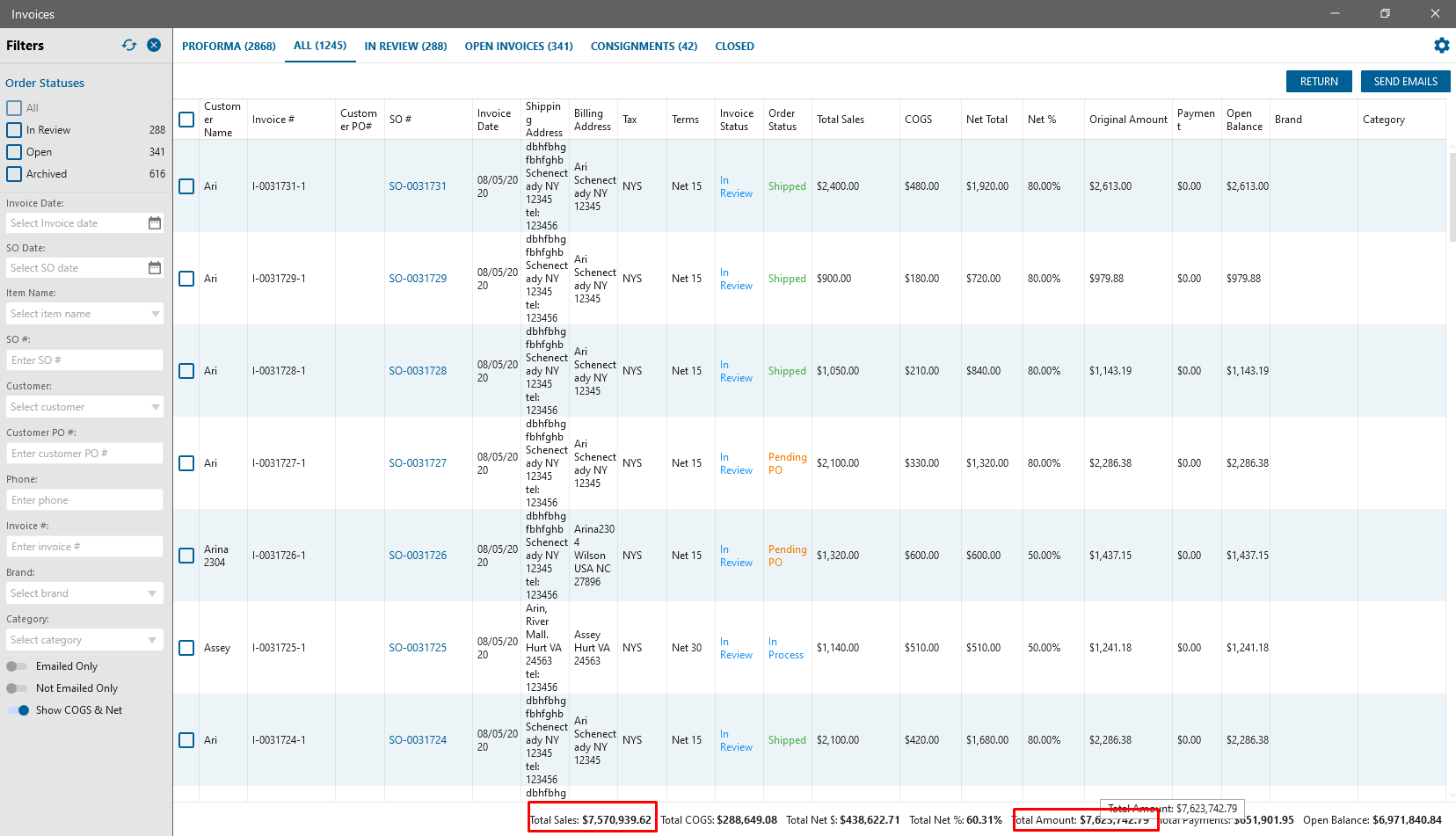 Total Sales is counted as Sum of Total Sales column without Tax and displayed with checked “Show COGS & Net”