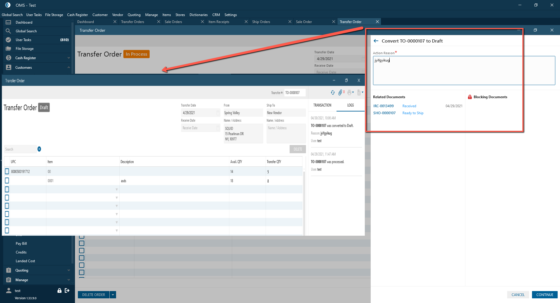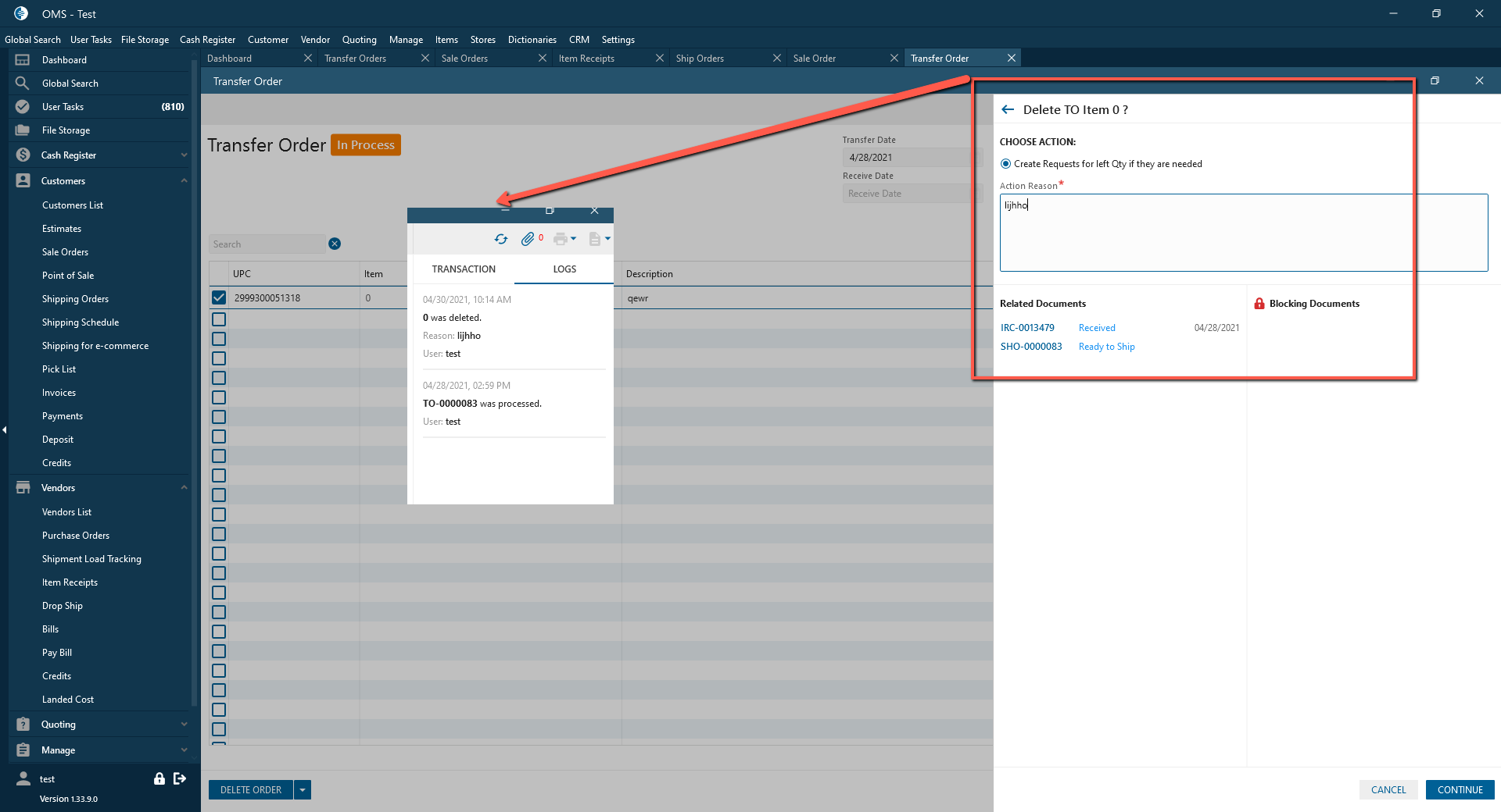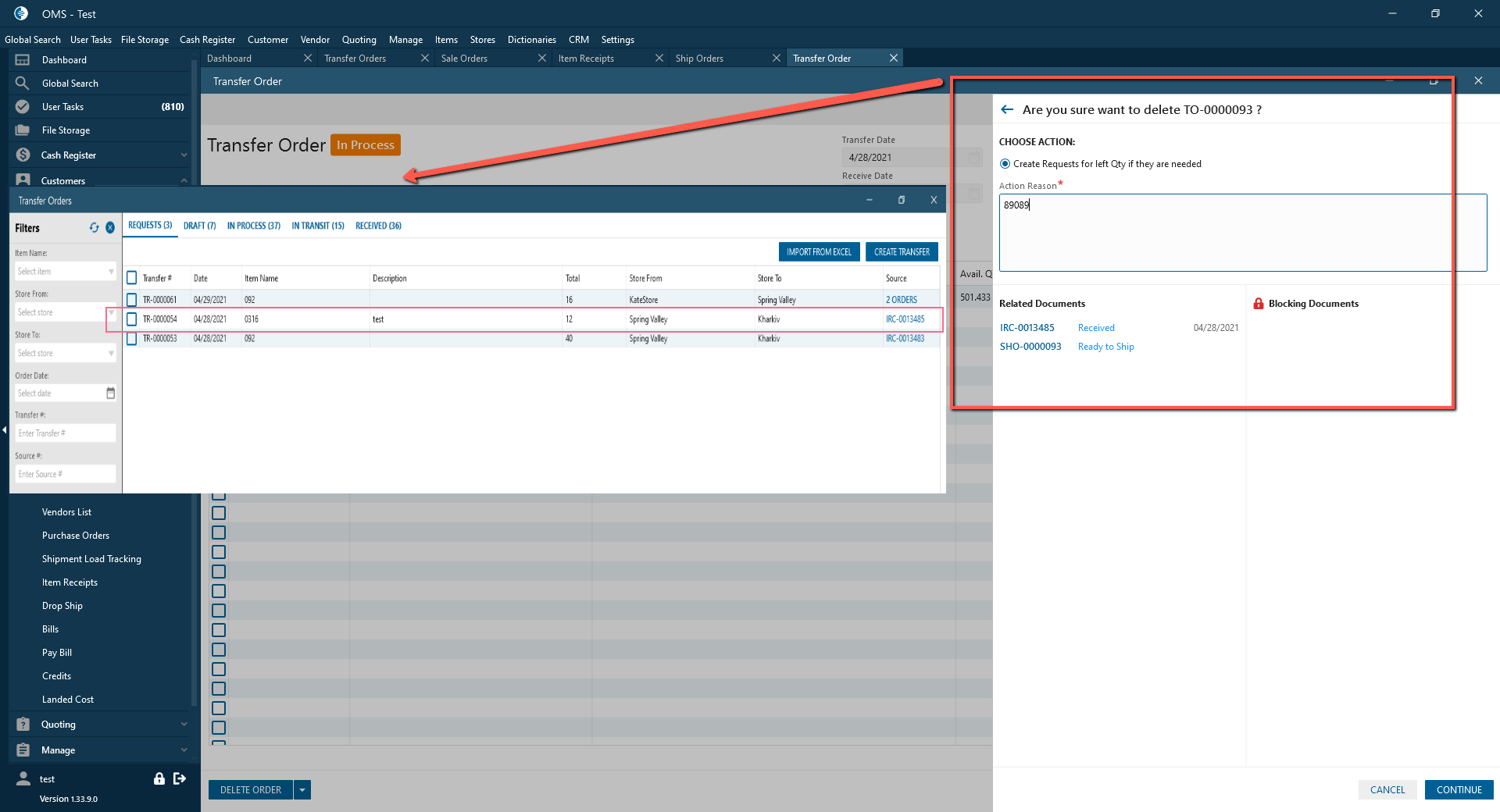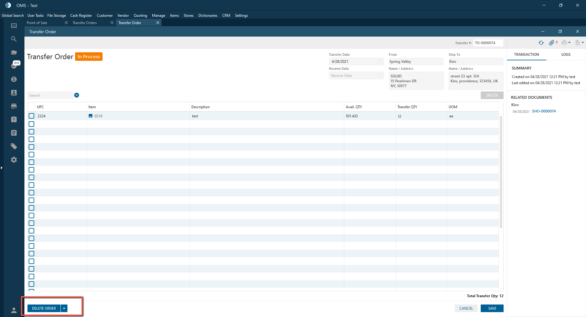 - Delete Transfer Order button: