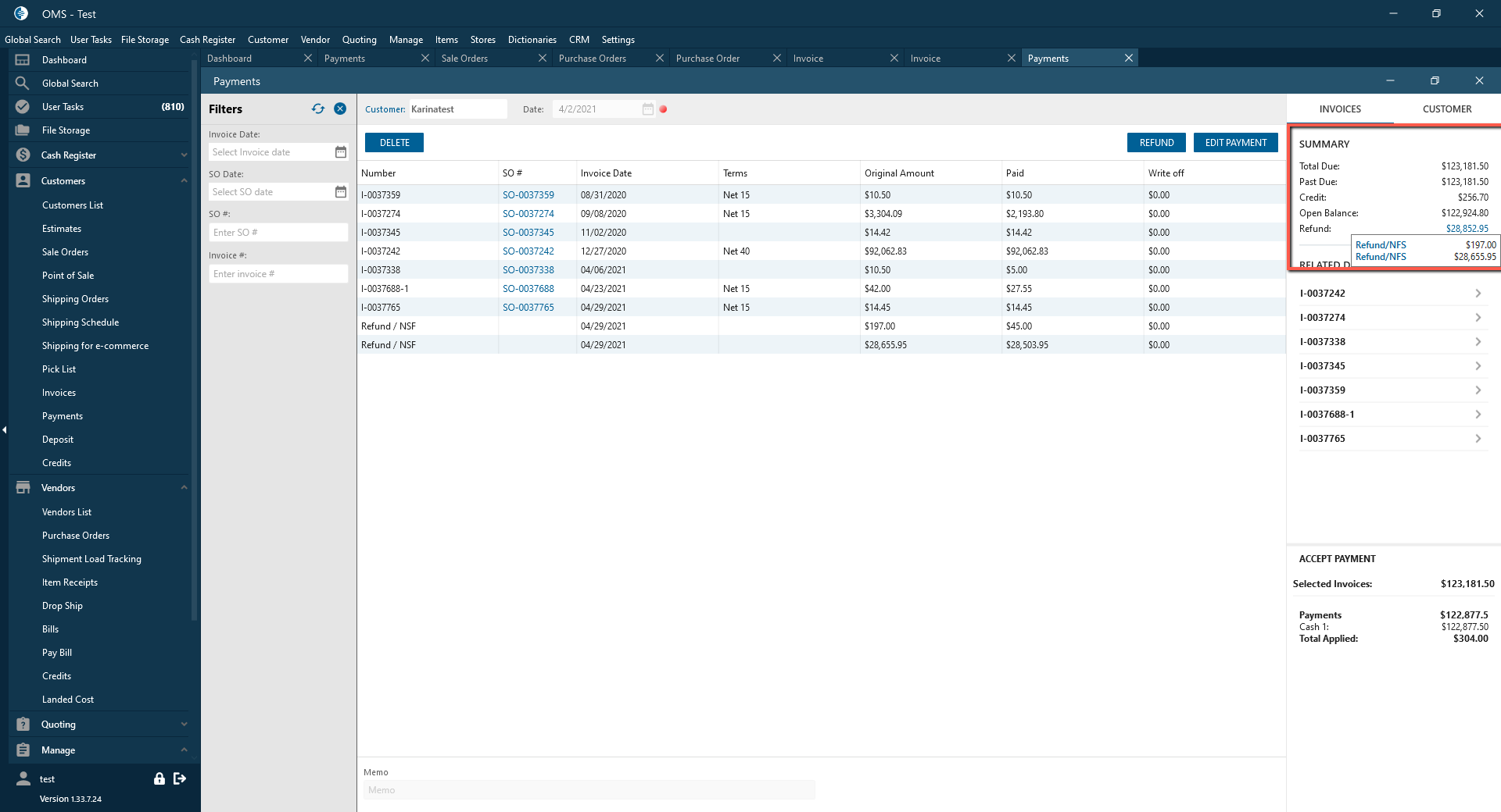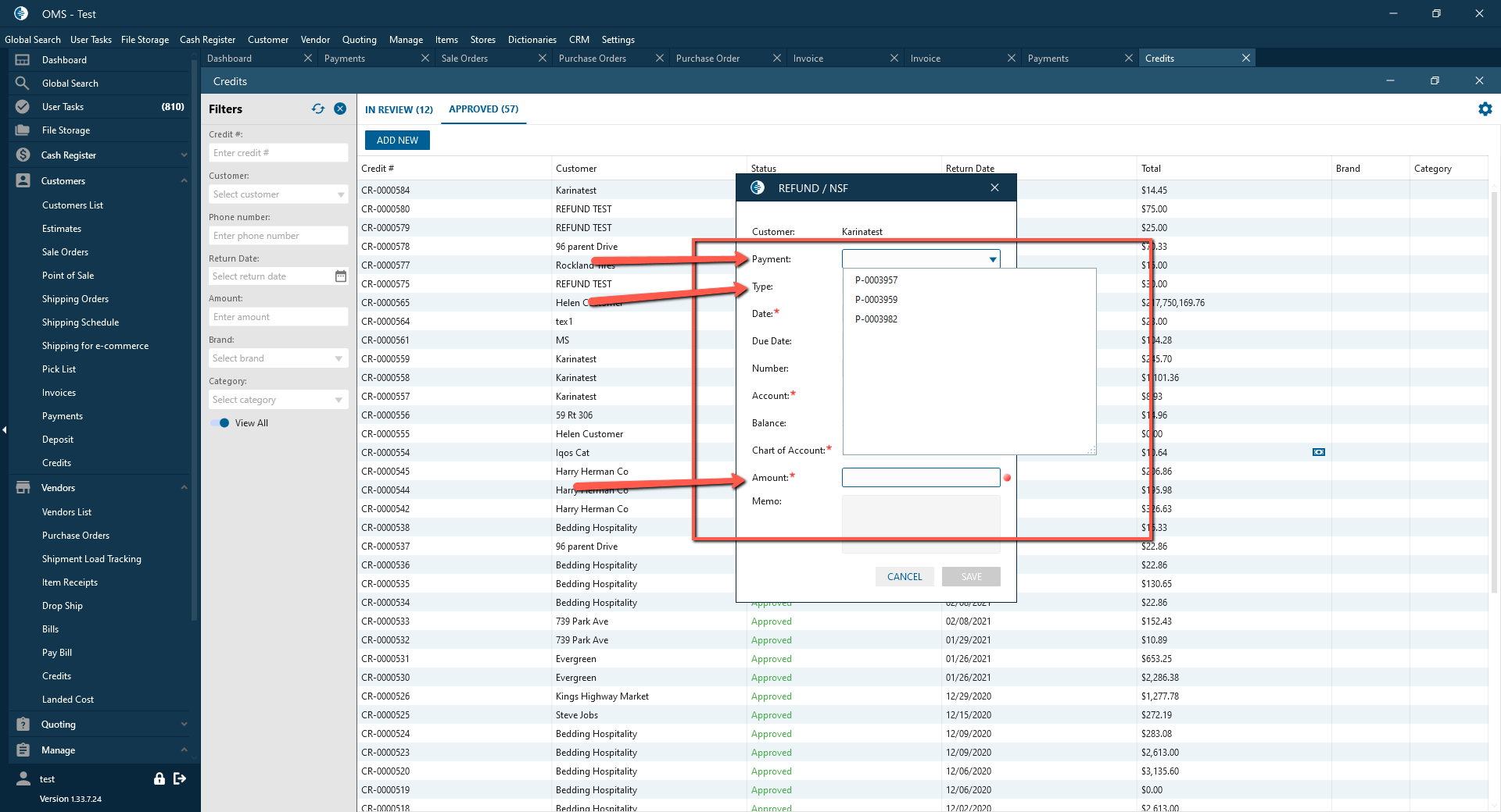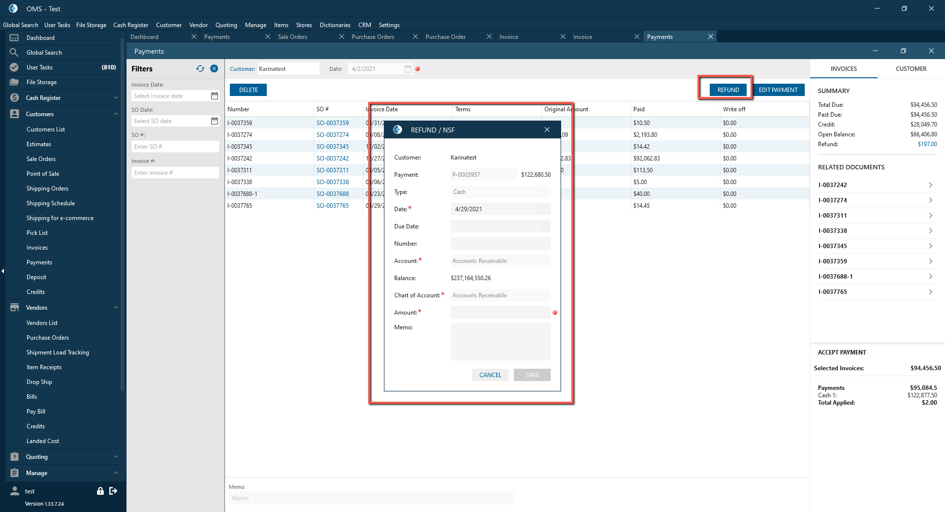 - after clicking on the button -> the “Refund/NSF” pop-up is opened;