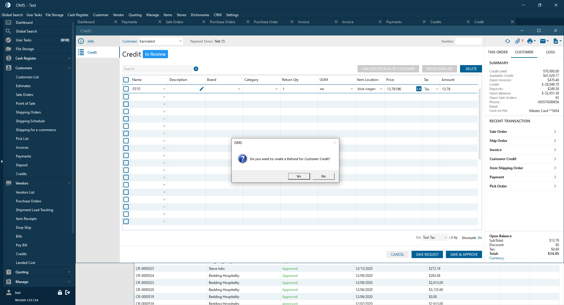- the message is displayed: “Do you want to create a Refund for Customer Credit? Yes/No”:
