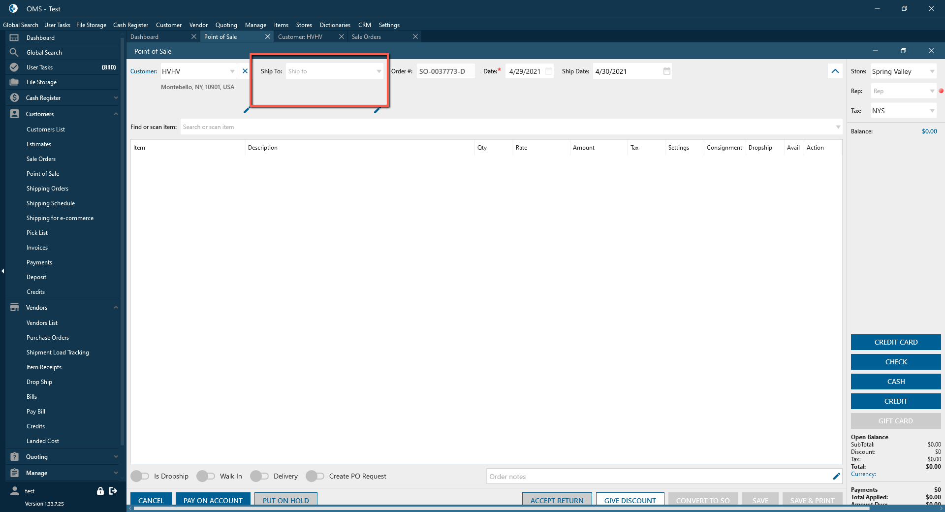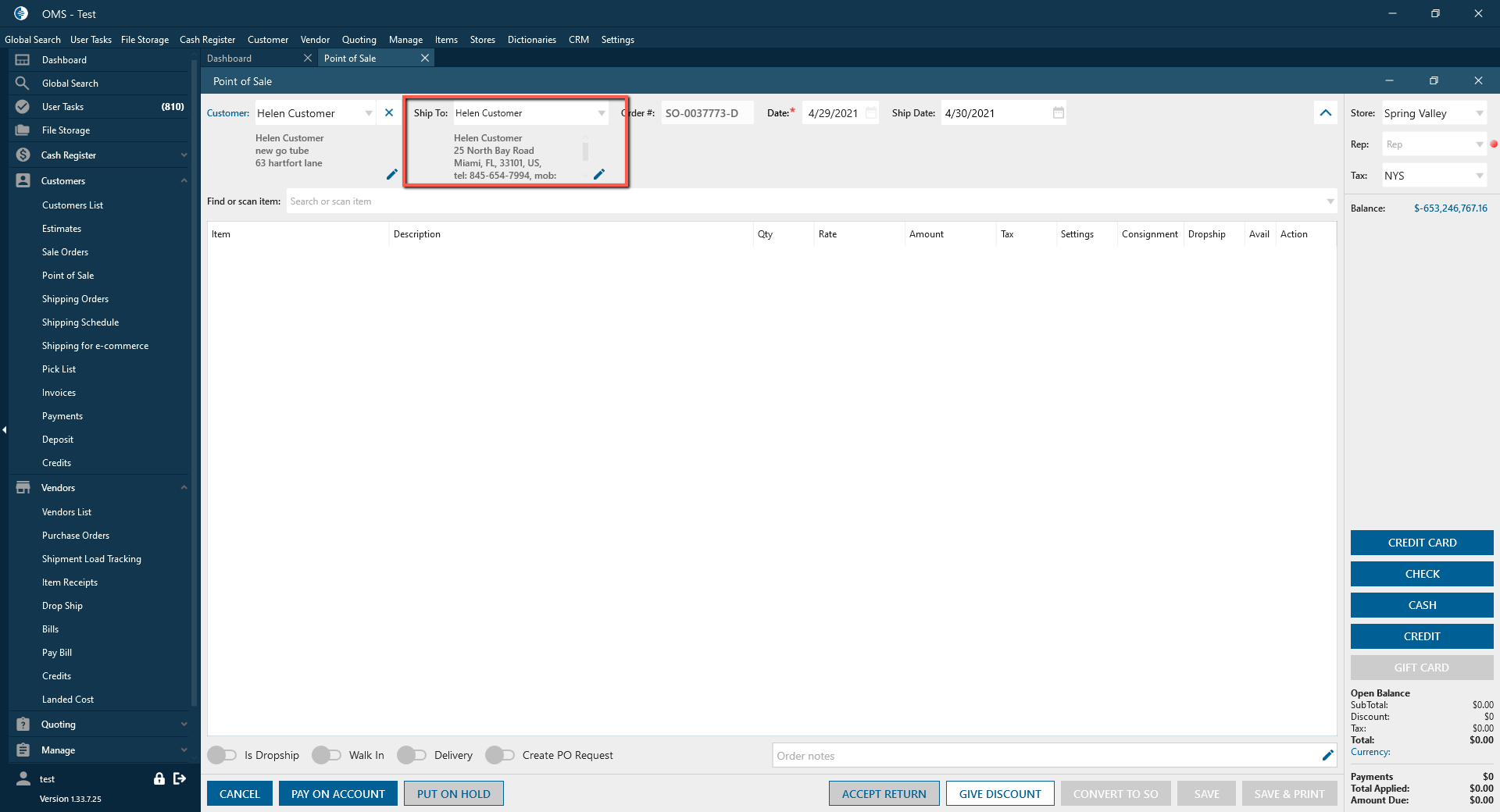 On the POS screen Ship To address is pulled correctly if Customer doesn’t have shipping addresses.