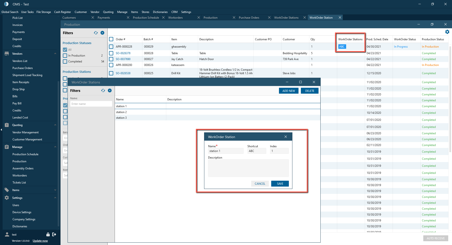 To the WorkOrder Station pop-up was added the ability to add a shortcut of the station. It is displayed in WorkOrder Station column in the Production list.