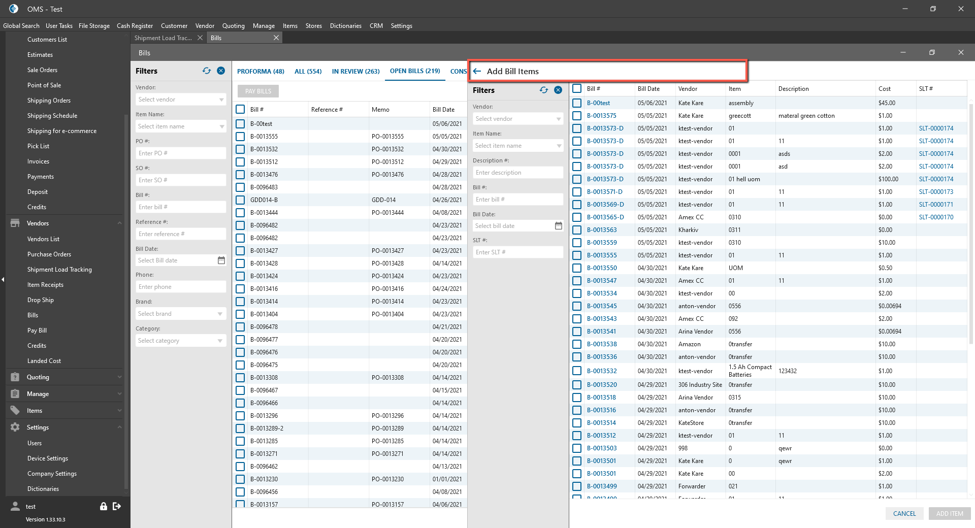 - After clicking on the button, the “Add Bill Items” Panel with Bill order items is opened;
