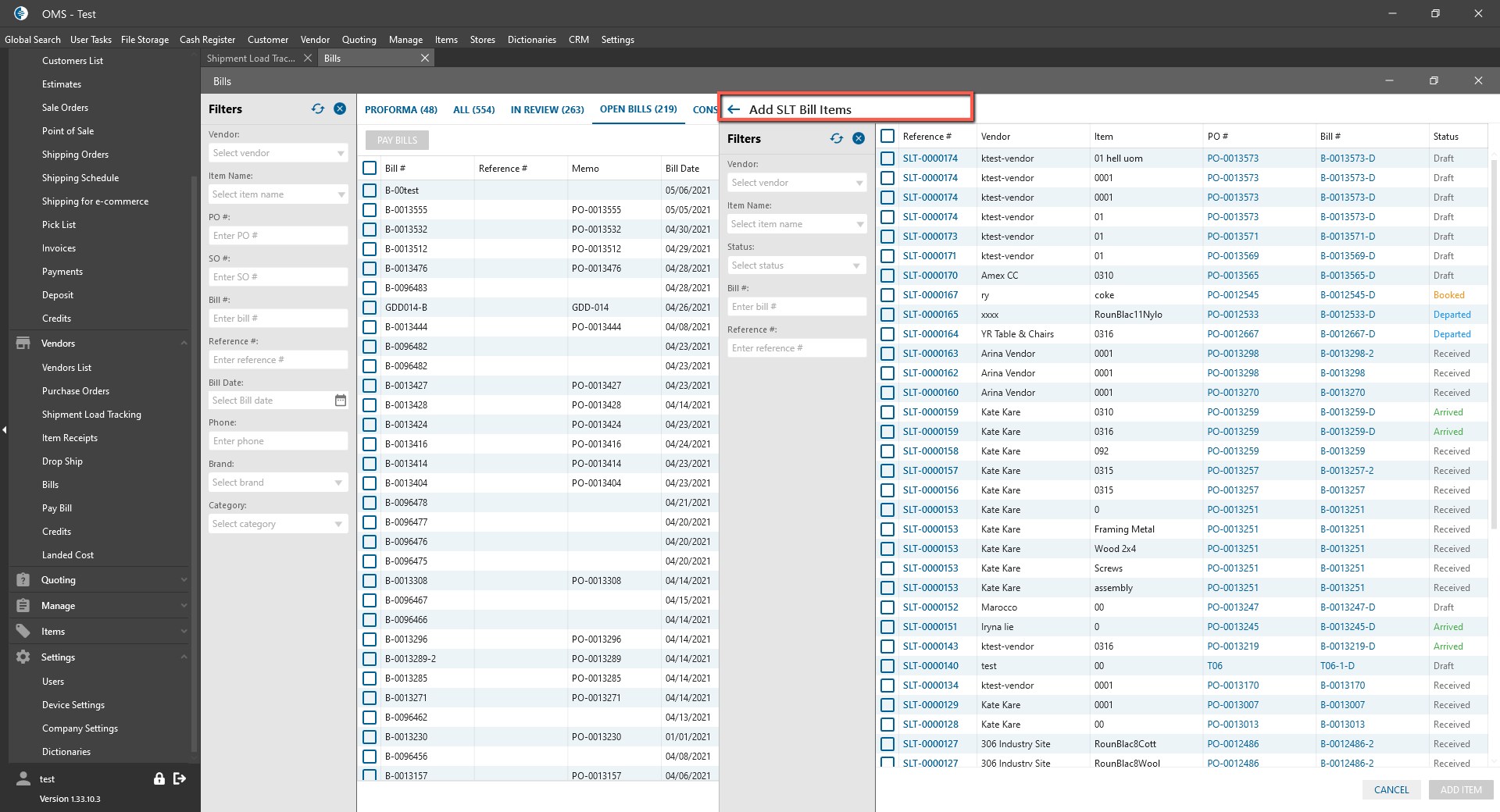 - After clicking on the button, the “Add SLT bill items” Panel with SLT orders is opened;