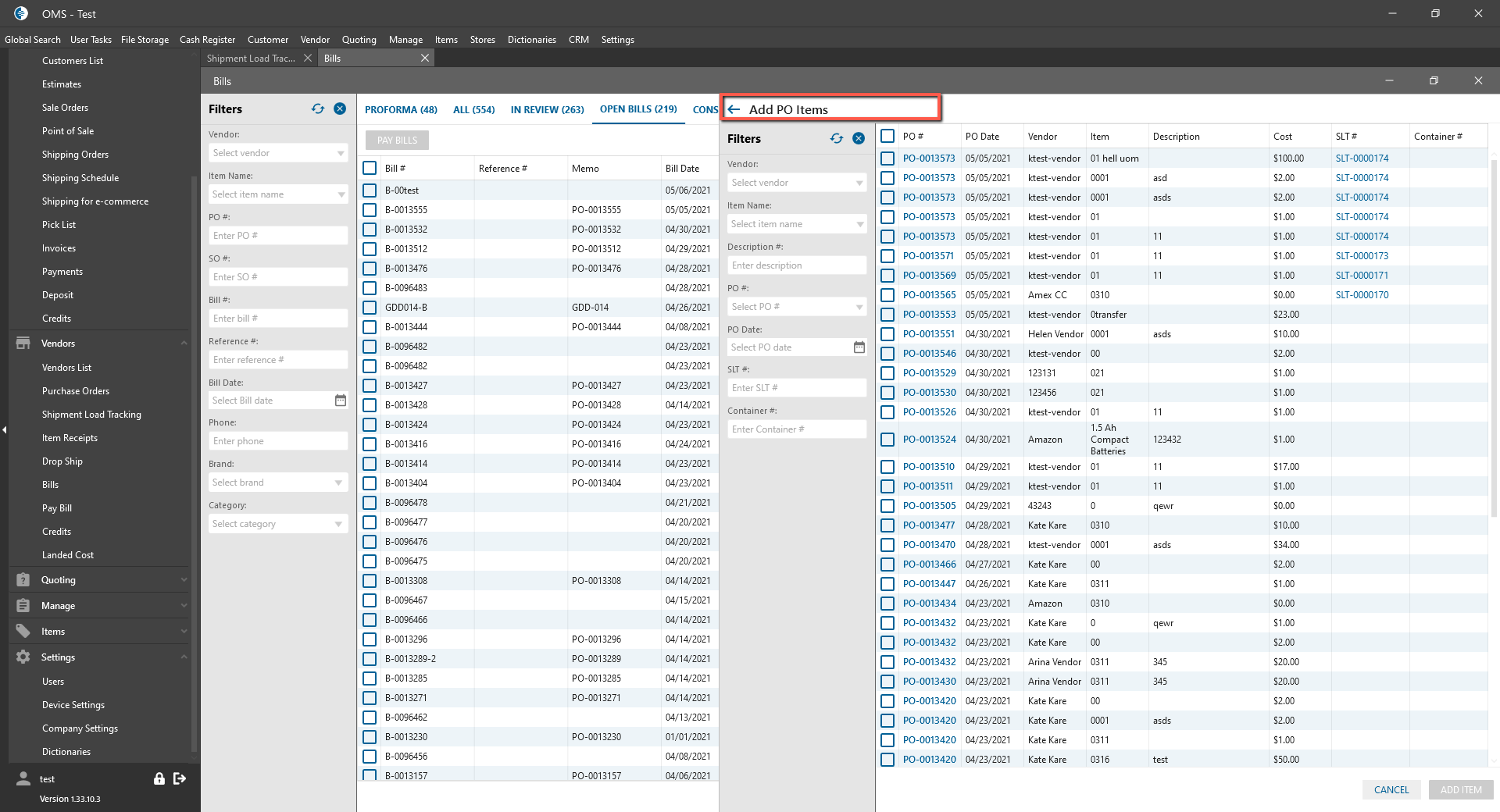 To In Review/Open Bills buckets was added Add PO Items multi-button: